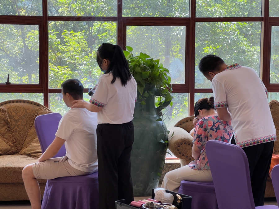 游客在溫泉景區(qū)內(nèi)體驗(yàn)艾灸。 惠州日報(bào)記者黃宇翔 攝