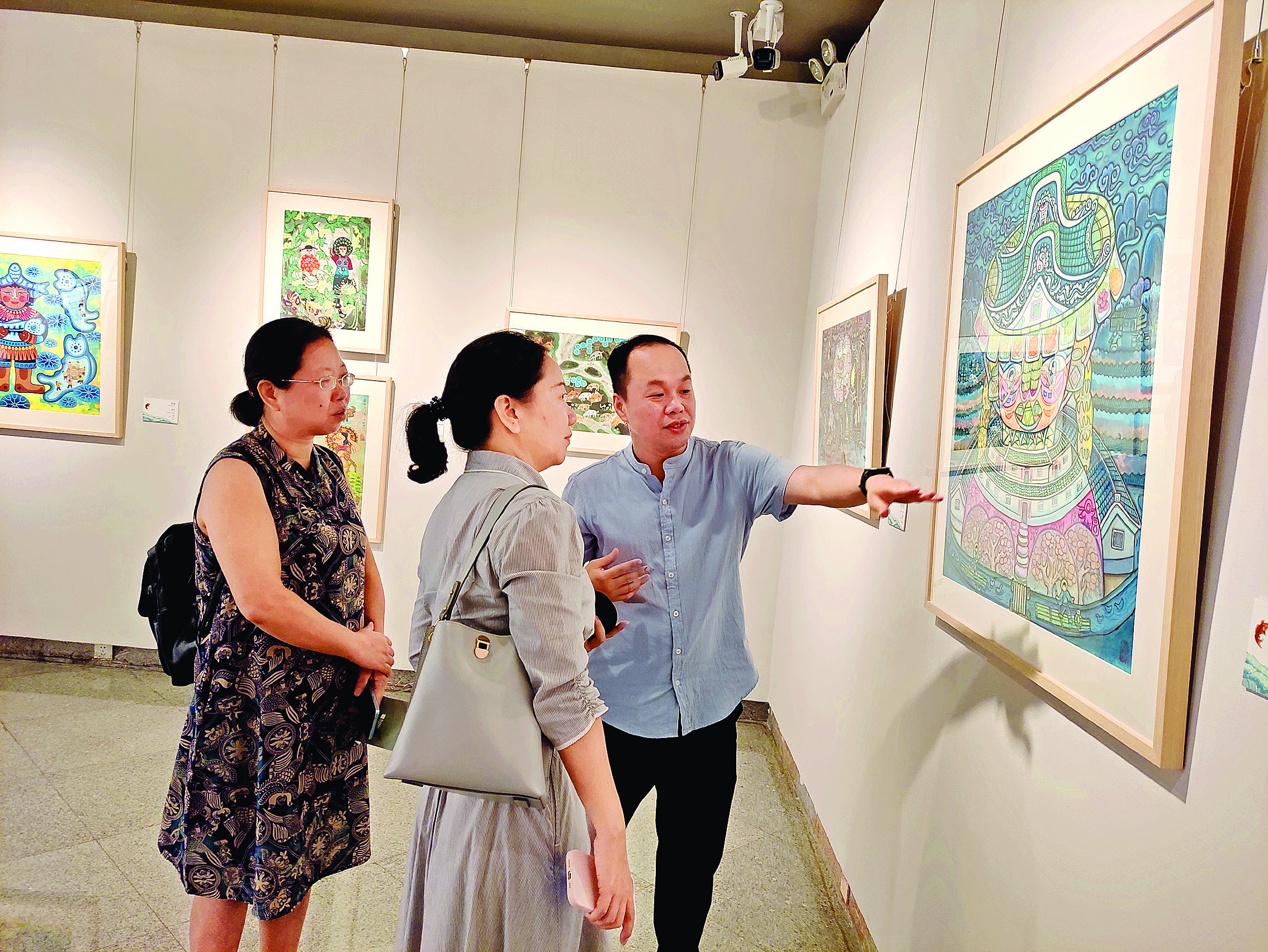 龍門農(nóng)民畫畫家鐘永廉(右一)向觀展市民介紹自己的參展作品。