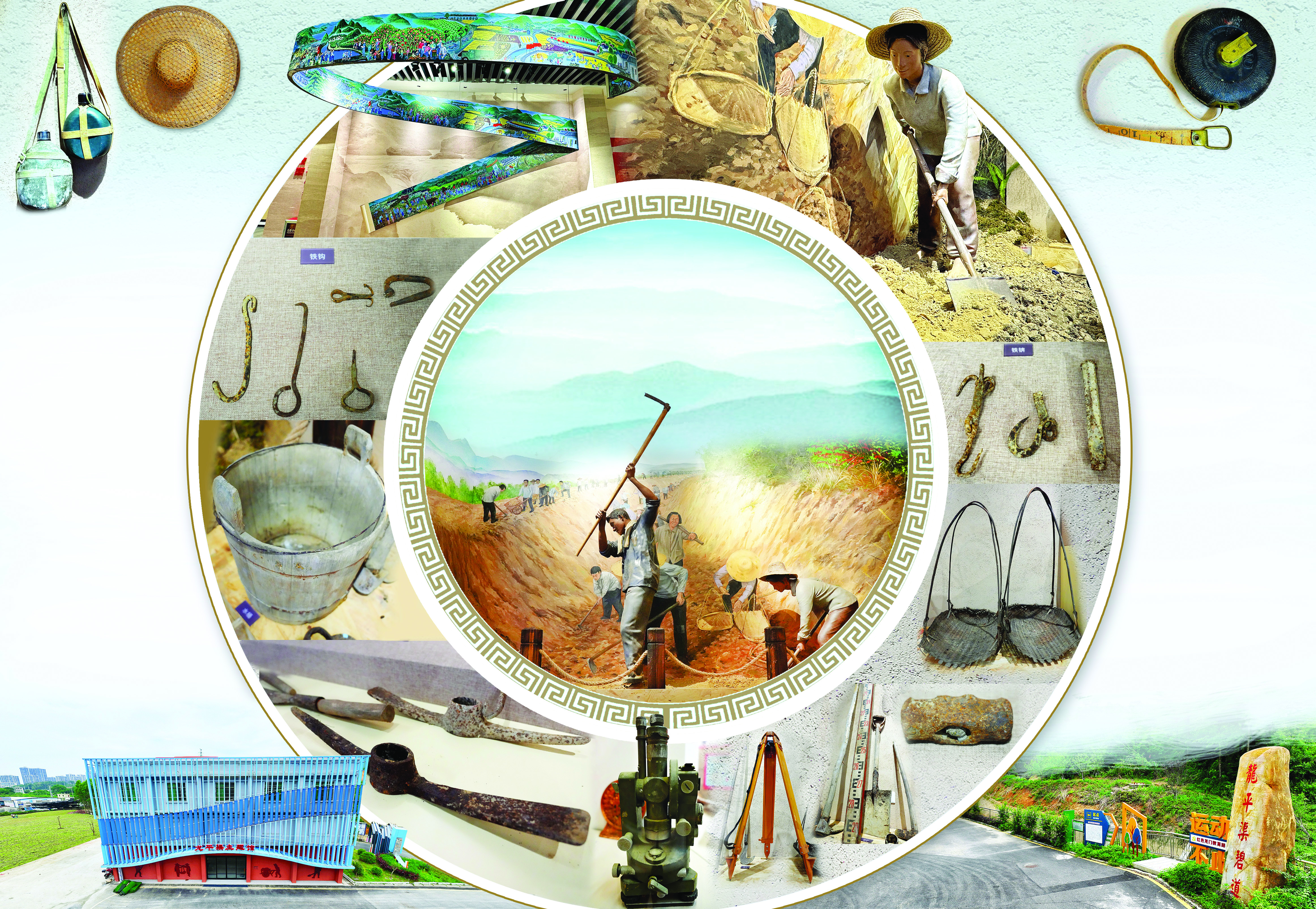 水壺。 竹編帽。 以農(nóng)民畫長卷展現(xiàn)修建過程。 鐵鉤。 水桶。 番釘。 “萬人大會(huì)戰(zhàn)”場景還原修渠歷史現(xiàn)場。 水準(zhǔn)測量儀。 以雕塑展示勞作場景。 鐵錛。 糞箕。 鐵錘。 水位測量儀。 RTK測量儀。 龍平渠主題館外觀。 皮尺。 龍平渠碧道。