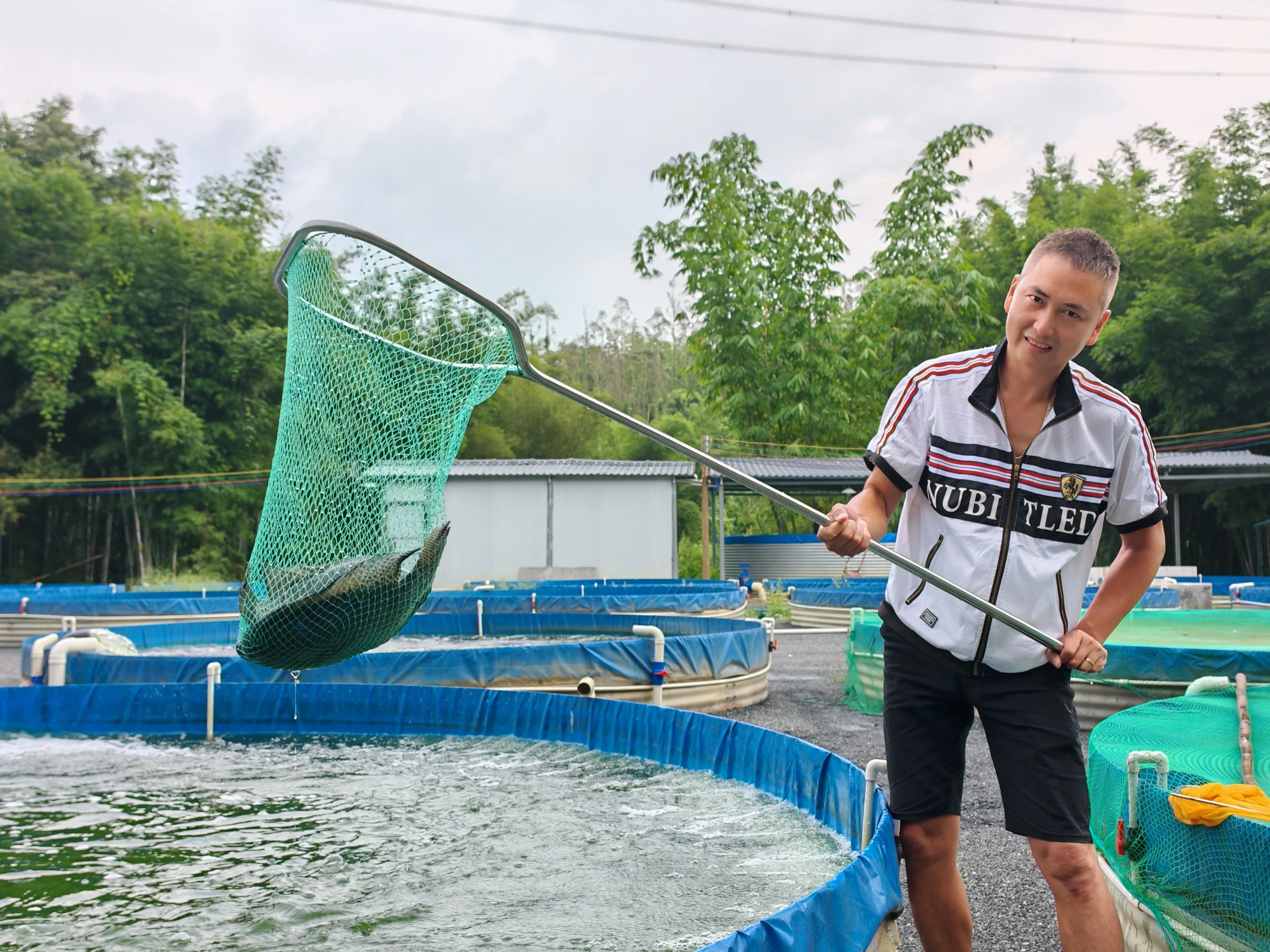 山下,一個(gè)個(gè)圓形養(yǎng)殖池整齊排列,池中水流呈漩渦式循環(huán)流動(dòng),魚兒在水池中“沖浪”,工作人員將網(wǎng)伸入水池深處,動(dòng)作絲滑地?fù)破鹨痪W(wǎng)魚,魚兒活蹦亂跳,水花四濺。