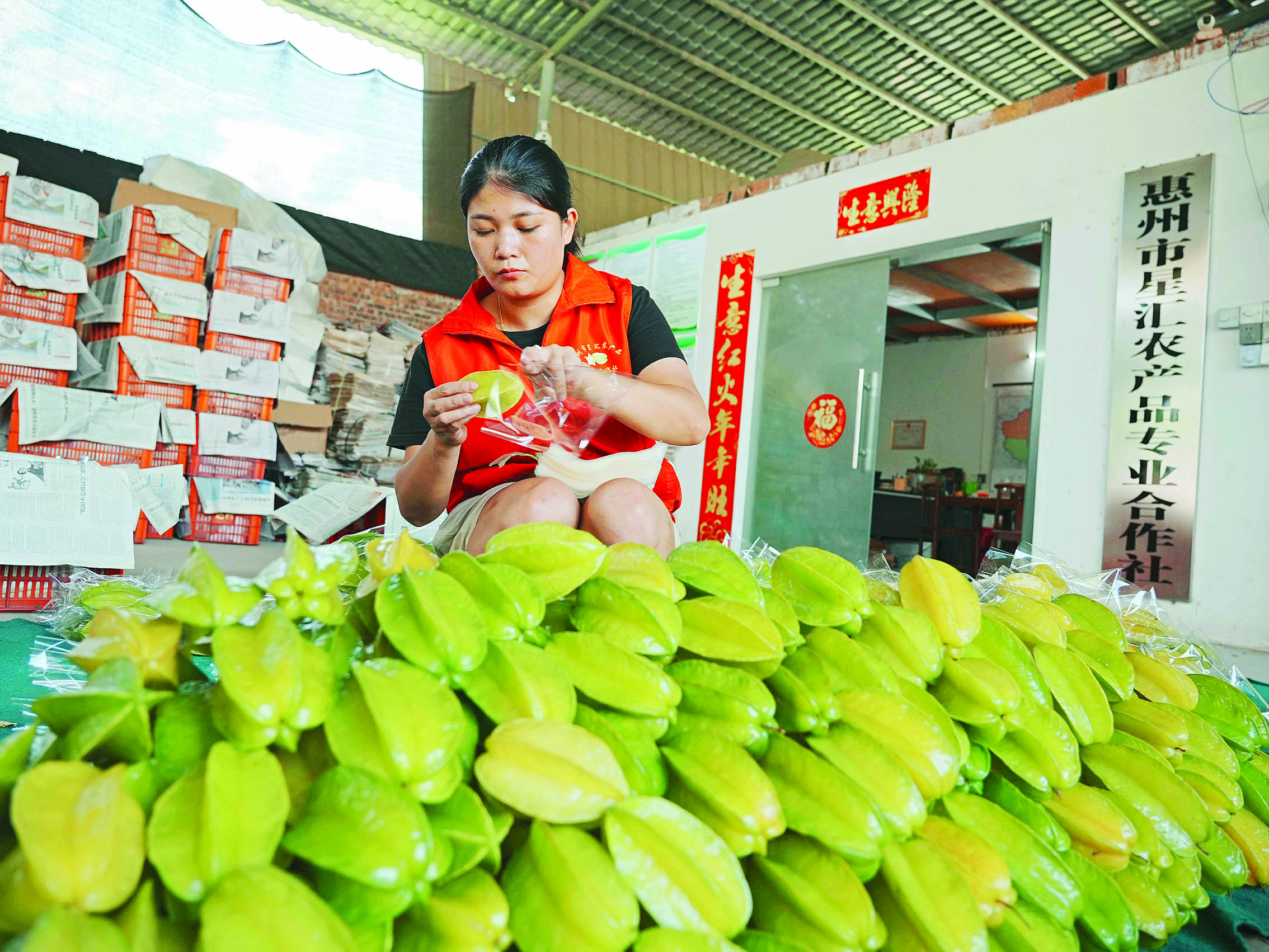 惠州市星匯農(nóng)產(chǎn)品專業(yè)合作社員工分揀包裝楊桃。