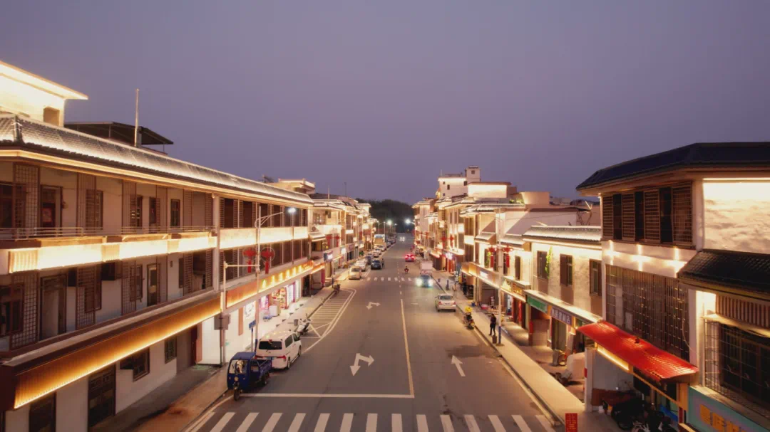 夜幕降臨,龍?zhí)钝捉值囊咕盁艄饬疗,點燃圩鎮(zhèn)新活力。