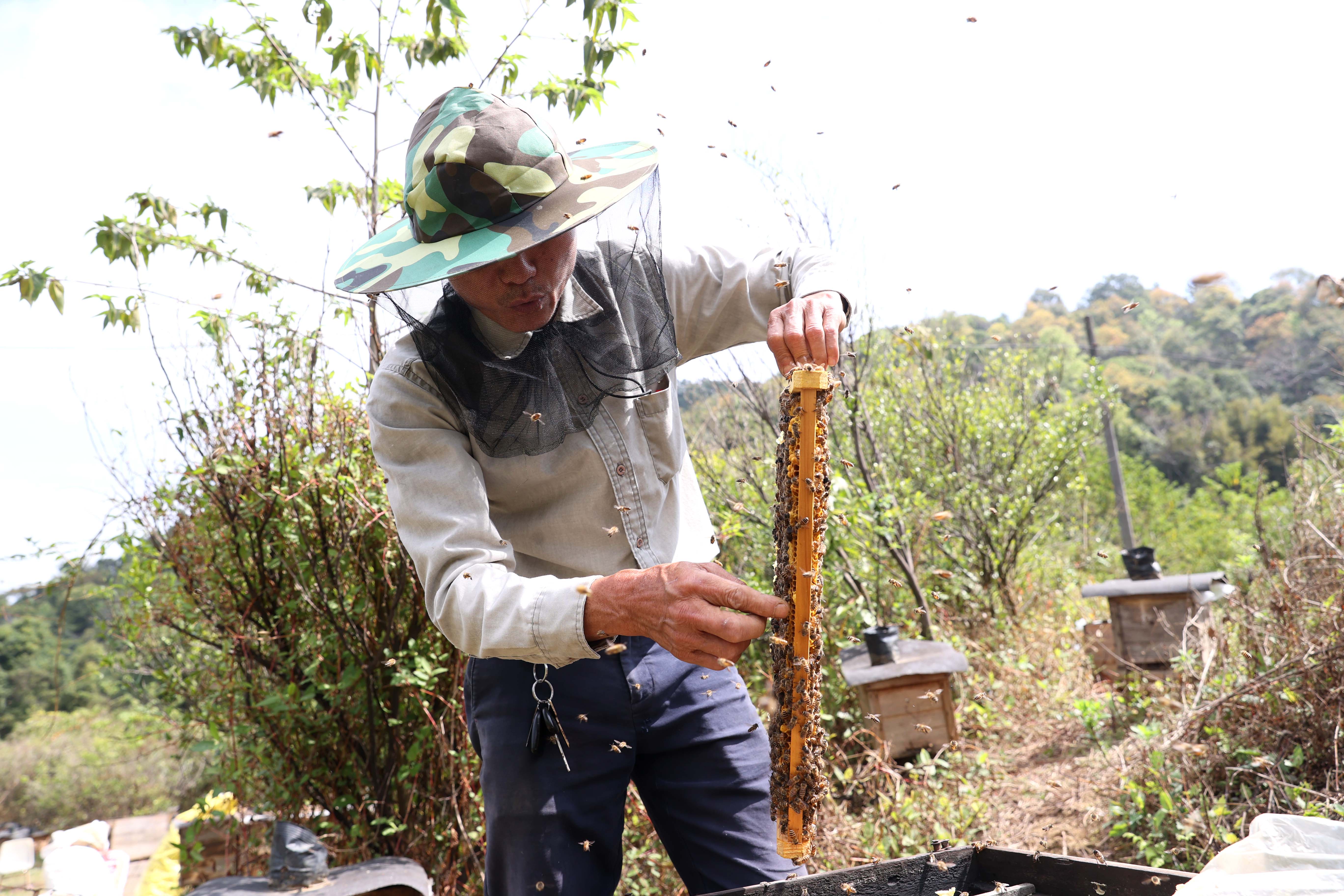 蜂農(nóng)鄭海強(qiáng)在查看蜂蜜情況。