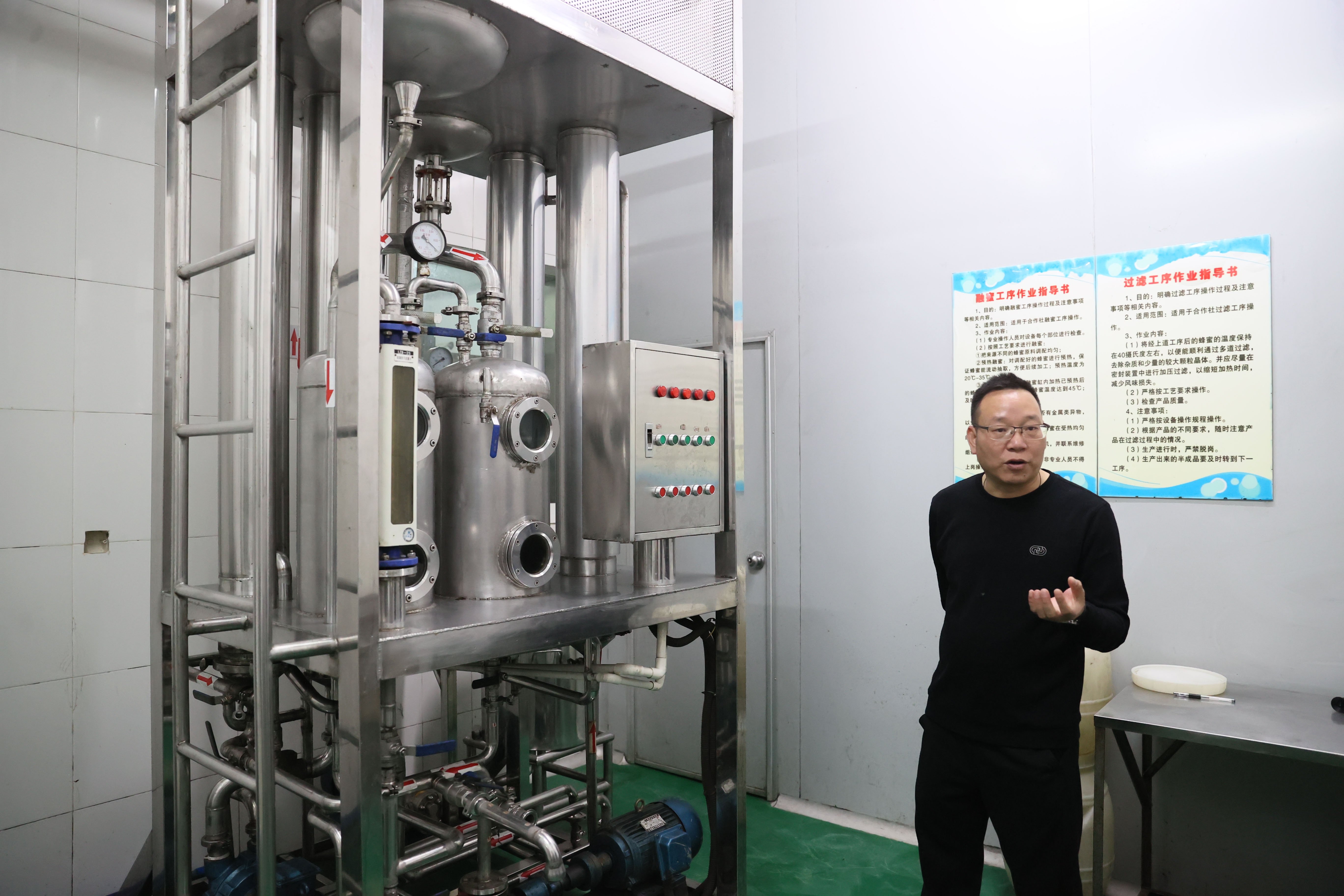 鐘國(guó)平在介紹蜂蜜初加工過(guò)程。
