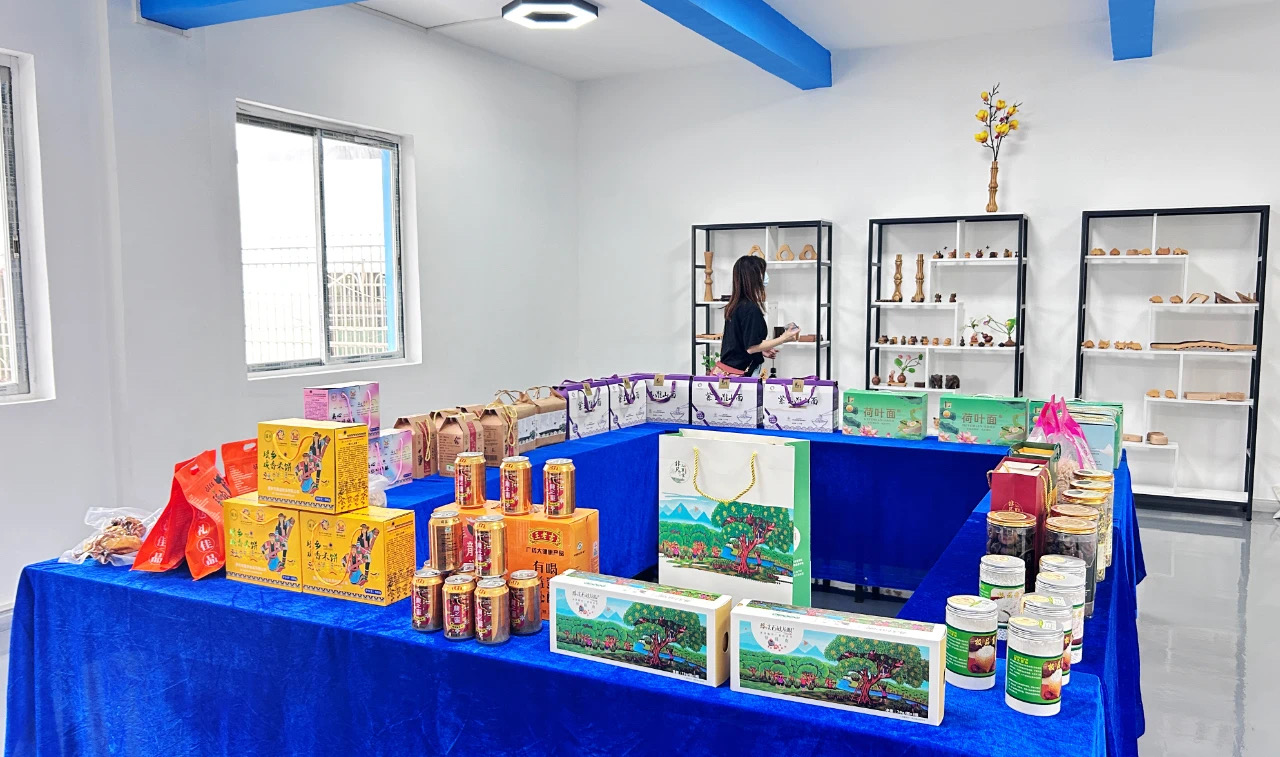 鄉(xiāng)村青年創(chuàng)業(yè)基地內(nèi)陳列的龍門特色農(nóng)產(chǎn)品。 惠州日報記者黃宇翔 通訊員龍融心 攝