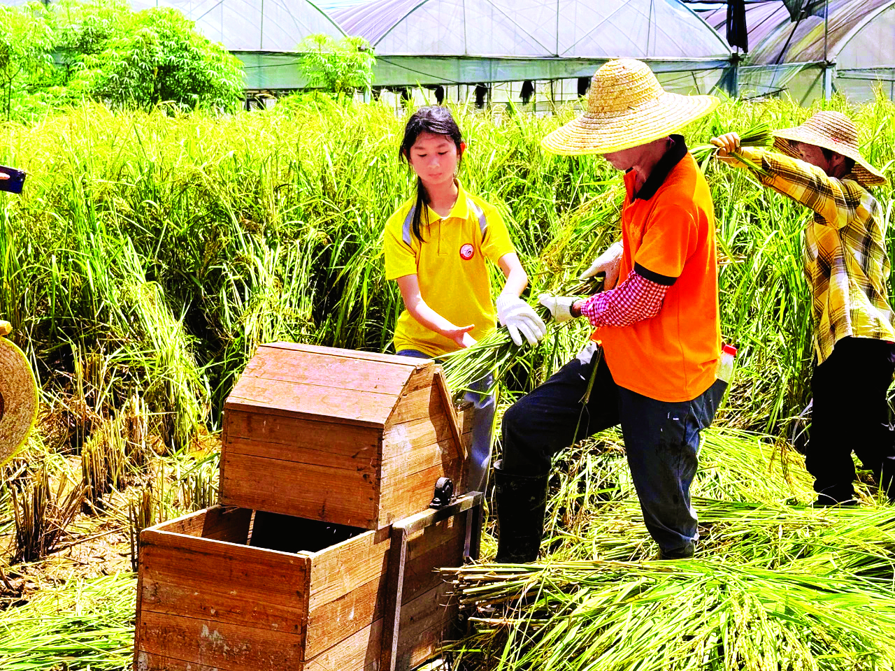 金秋時節(jié),稻浪翻滾。8月26日,龍門縣龍?zhí)镦?zhèn)鄔村的巨型稻試驗田里熱鬧非凡,來自龍?zhí)镦?zhèn)第一小學的學生們化身“稻田偵察兵”,鉆進比自身還高的金色稻叢,開啟一場沉浸式的“知‘稻’計劃”研學之旅。在這里,課本中《憫農》的詩句從文字變?yōu)楝F(xiàn)實,傳統(tǒng)農耕與現(xiàn)代農機的碰撞,讓孩子們在勞作中讀懂“粒粒皆辛苦”的深意。