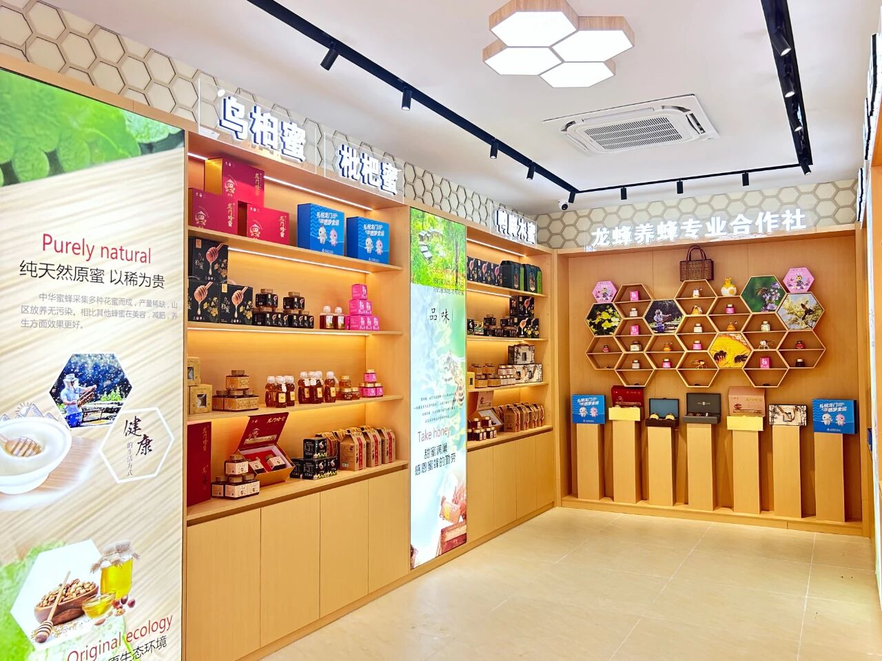 龍門縣養(yǎng)蜂研究所的展示區(qū),鴨腳木蜜、姜檸蜂蜜等產(chǎn)品整齊陳列。 惠州日?qǐng)?bào)記者黃宇翔 通訊員龍融心 攝