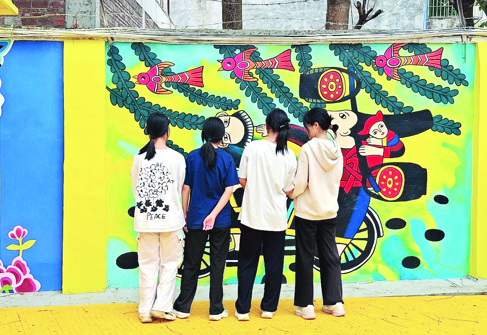 學(xué)生在圍墻前欣賞龍門農(nóng)民畫。 惠州日?qǐng)?bào)記者黃宇翔 通訊員龍融心 攝