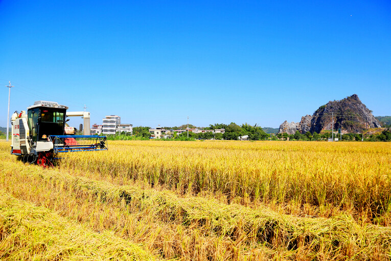收割機(jī)開足馬力在稻田里穿梭收割水稻。 資料圖片