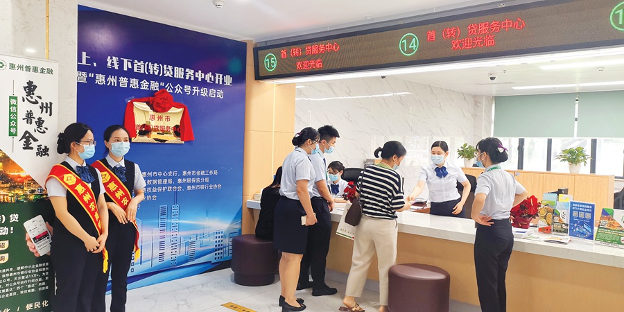 去年6月,惠州市首(轉(zhuǎn))貸服務(wù)中心揭牌。圖為市民在中心咨詢業(yè)務(wù)。 惠州日?qǐng)?bào)記者劉煒煒 攝