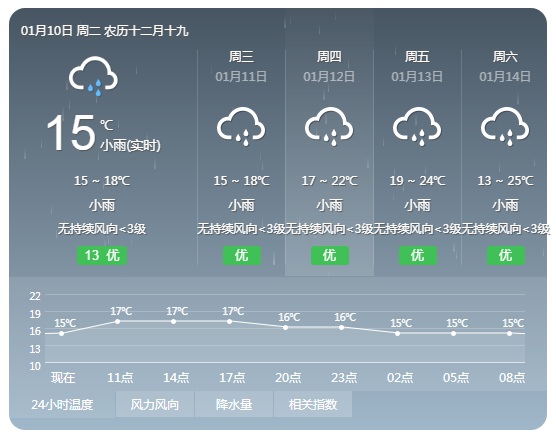 惠州一周天氣預報預計,10日,小雨轉陰天,氣溫15~18℃;11日,陰天,有小到中雨,氣溫15~18℃;12日,小到中雨局部大雨,氣溫15~20℃;13日到14日,小到中雨轉陰天,氣溫回升;15日起,受冷空氣影響,各地云量逐漸減少,北風加大,氣溫明顯下降。