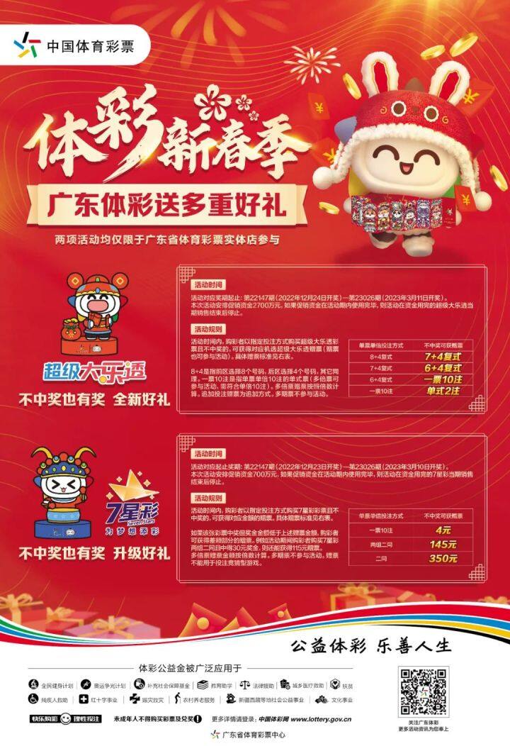 “超級大樂透不中獎也有獎”是廣東體彩的經(jīng)典活動,本次活動在大樂透第22147期(2022年12月24日開獎)至第23026期(2023年3月11日開獎)期間開展,安排活動資金2700萬元。如果活動資金提前使用完畢,則活動在資金用完的超級大樂透當(dāng)期銷售結(jié)束后停止。