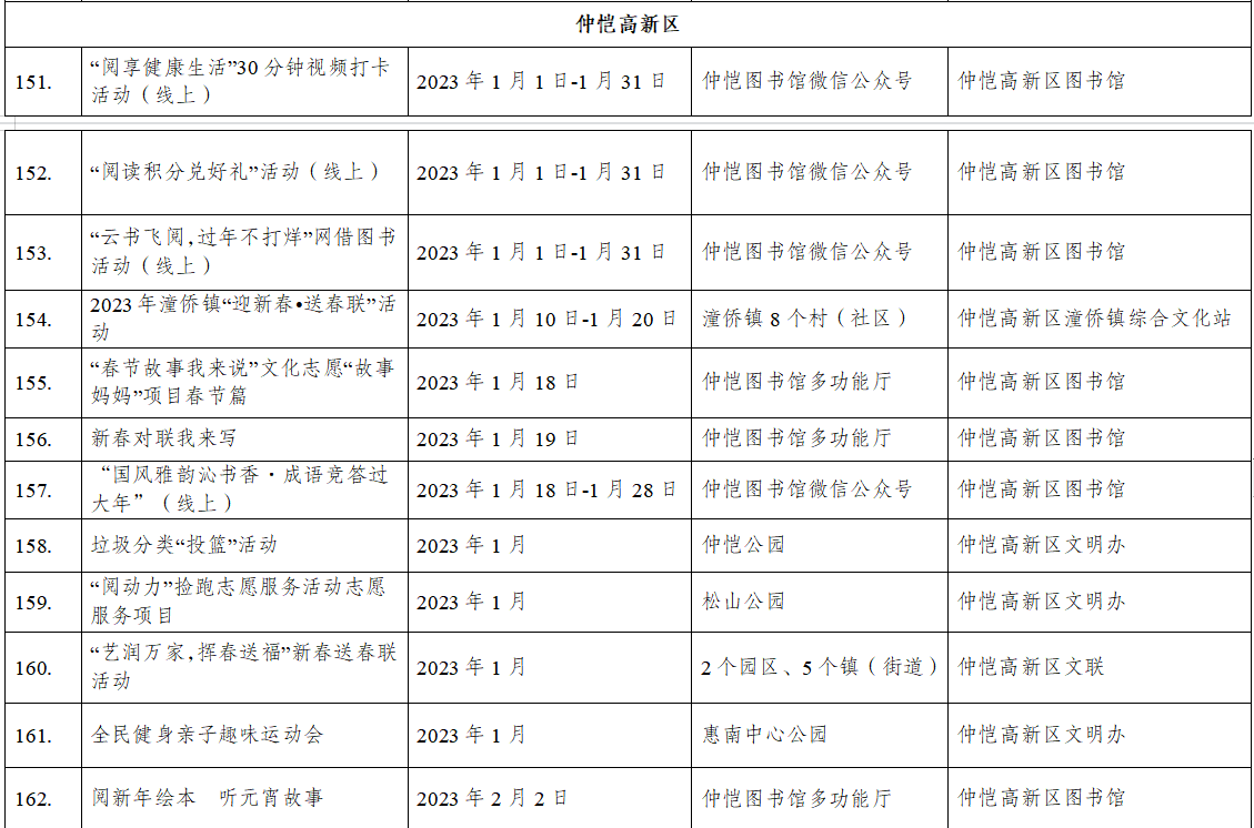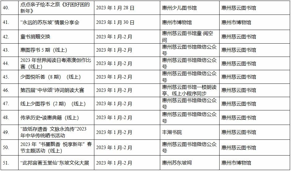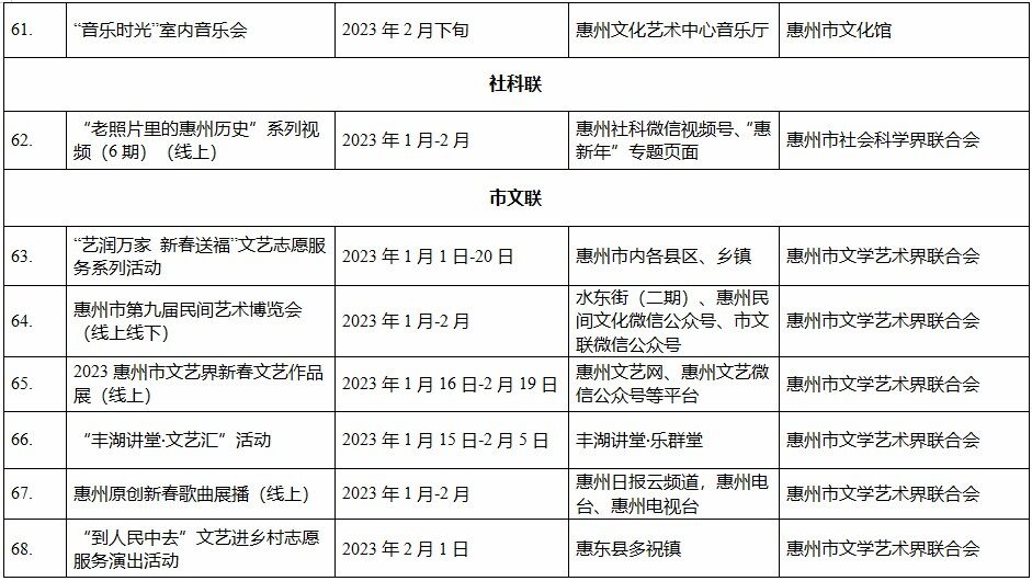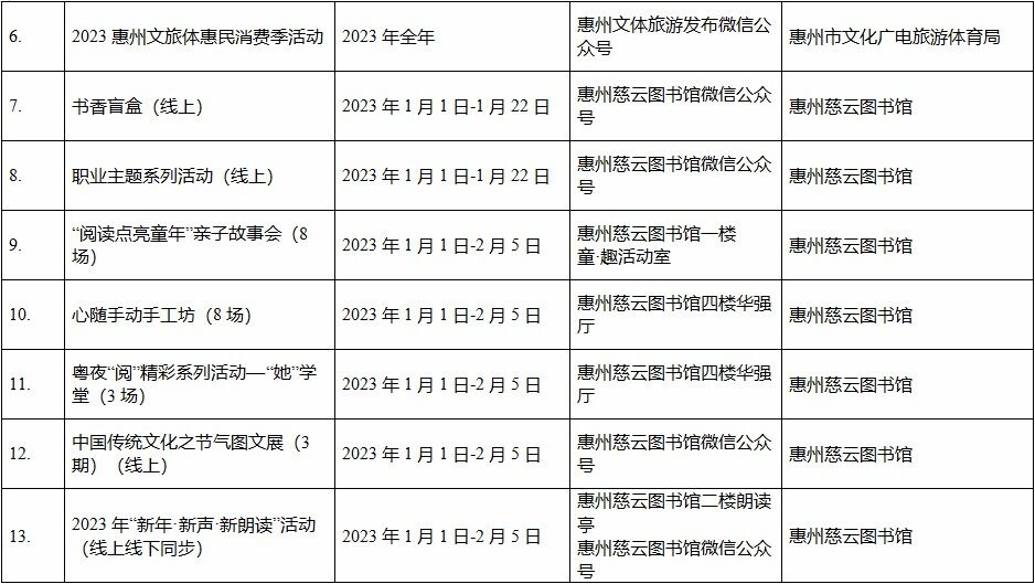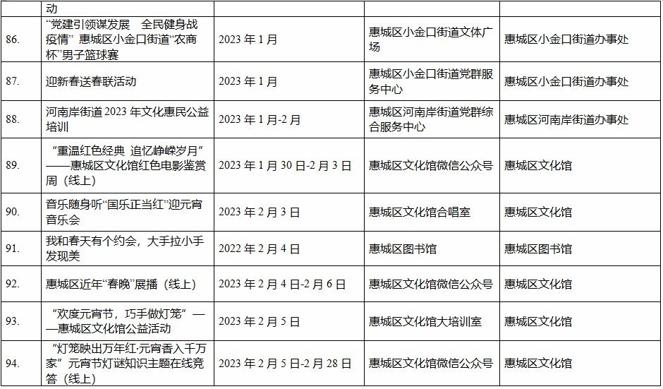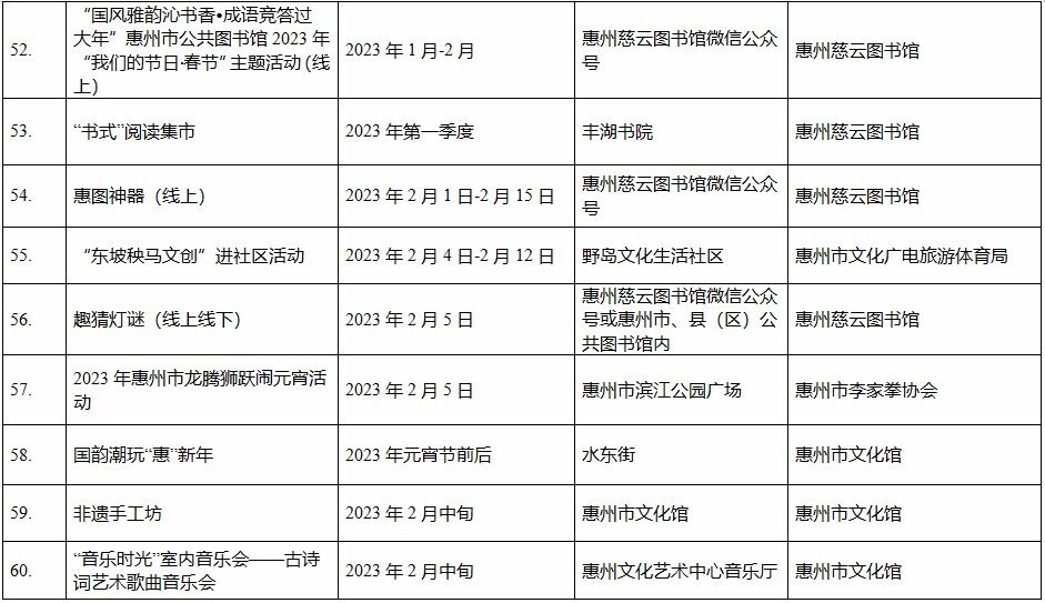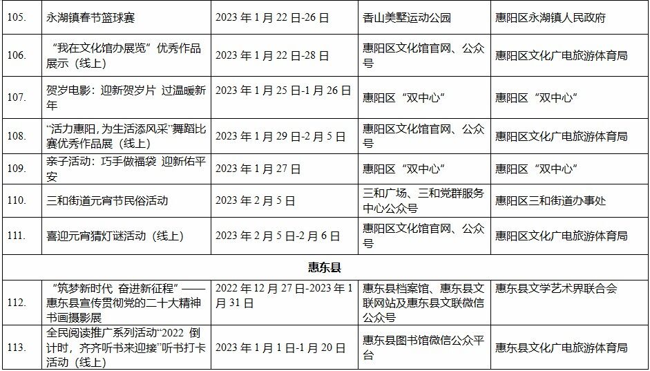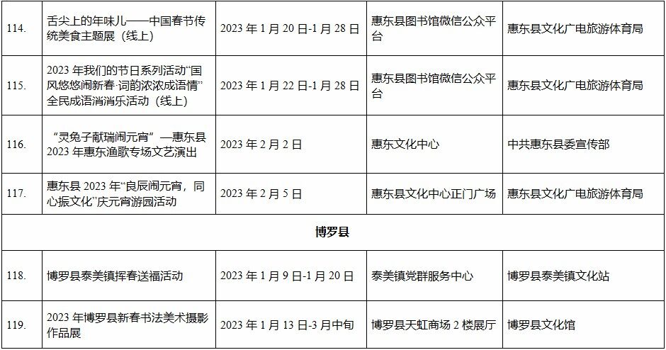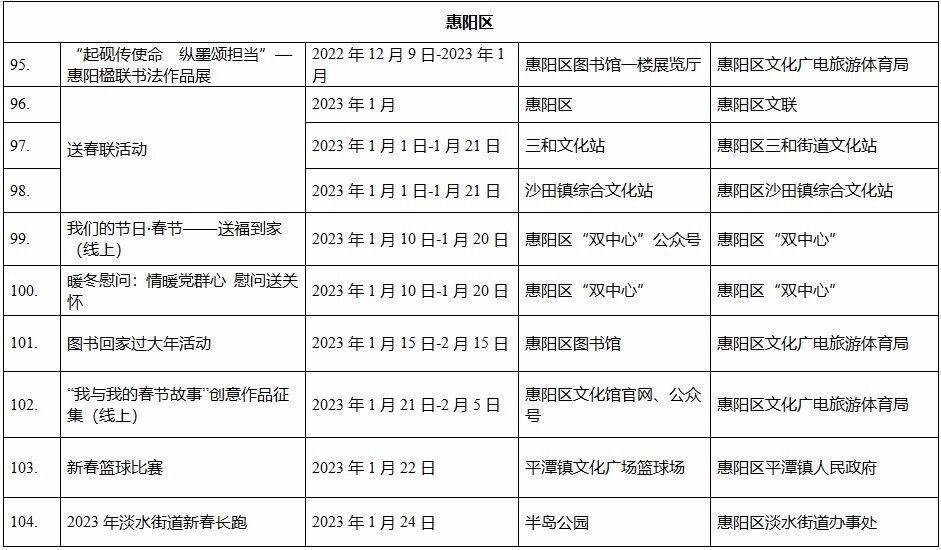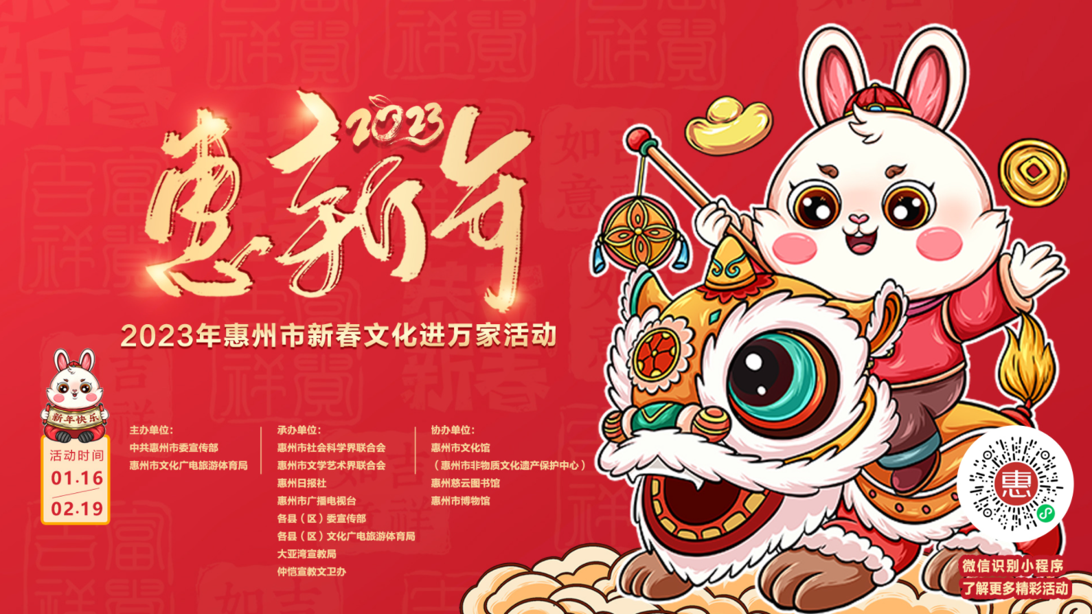 到各大公共文化場館打卡、參加線上線下各類文化活動(dòng)、感受傳統(tǒng)中國年味、云上賞戲劇……1月15日,記者從市委宣傳部獲悉,“惠新年”——2023年惠州市新春文化進(jìn)萬家活動(dòng)將于1月16日全面啟動(dòng)。活動(dòng)將持續(xù)到2月19日,覆蓋整個(gè)農(nóng)歷新年,惠州市委宣傳部將統(tǒng)籌組織各縣(區(qū))、市直宣傳文化單位力量,開展逾170場主題線上線下活動(dòng),進(jìn)一步營造喜慶、團(tuán)結(jié)、祥和的節(jié)慶氛圍,讓廣大市民游客在惠過年游得舒心、玩得盡興。