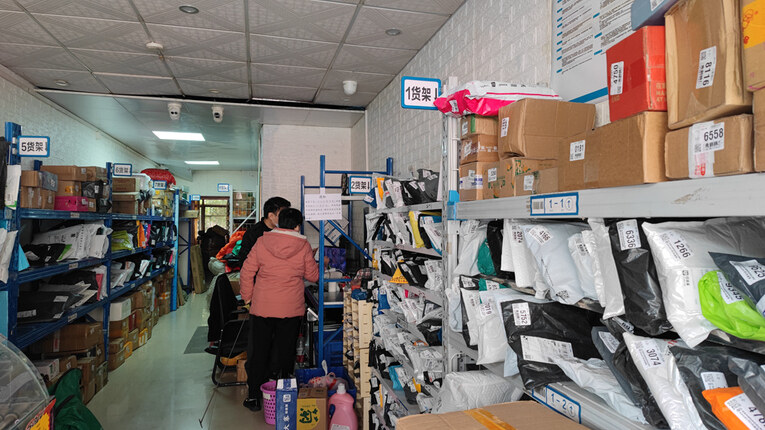 水北新村菜鳥(niǎo)驛站的貨架上擺滿了快遞包裹。