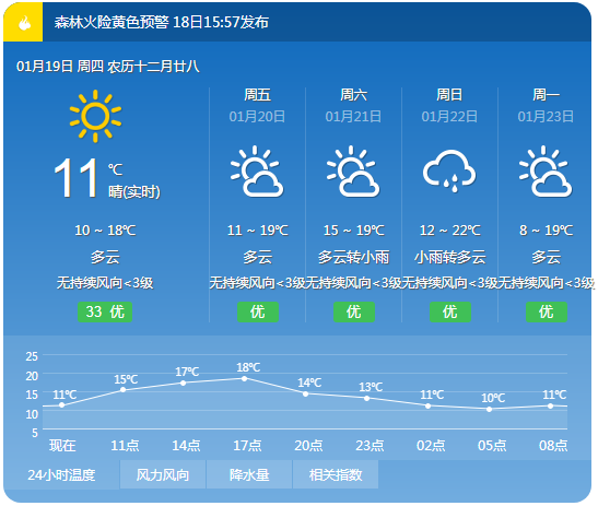 具體預(yù)報(bào):19日,晴天間多云,7—19℃;20日,晴天間多云,9—20℃;21—22日(除夕至初一),多云到陰天,間中有零星小雨和輕霧,氣溫繼續(xù)上升;展望23—24日(初二至初三),受冷空氣影響,多云為主,氣溫下降。未來三天早晚寒冷,需注意防寒保暖,并注意室內(nèi)通風(fēng),慎防使用煤氣導(dǎo)致一氧化碳中毒。