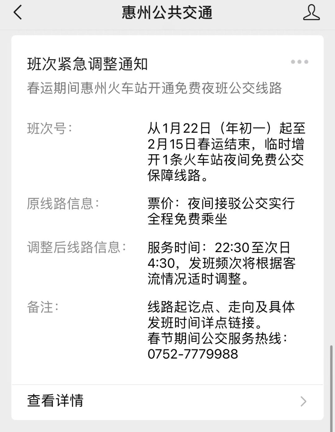 為保障火車站夜間旅客出行,避免發(fā)生旅客滯留現(xiàn)象,1月22日(年初一)起至2月15日,我市臨時(shí)增開1條火車站夜間免費(fèi)公交保障線路,22:30至次日4:30,共發(fā)4個(gè)班次,發(fā)班時(shí)間為22:30、2:30、3:30、4:30(23:00-次日2:00之間無(wú)列車進(jìn)站,暫停發(fā)班)。