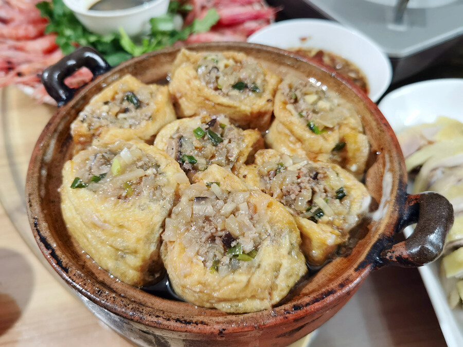 比如我們熟悉的釀豆腐,惠州人民可能更喜歡用白豆腐直接釀豬肉加小蔥,然后煎煮一下就可以吃了。尋烏人過年時,則更喜歡用煎好的油豆腐來釀,而且餡料更多,除了豬肉、小蔥,還會加上香菇、紅蘿卜、蝦米、魷魚絲等,釀得滿滿當(dāng)當(dāng),形成方方圓圓的肉丸形狀,所以又稱“麻包豆腐”。在年夜飯餐桌上,幾乎每家每戶都會端上一大碗尋烏麻包豆腐,寓意團團圓圓。