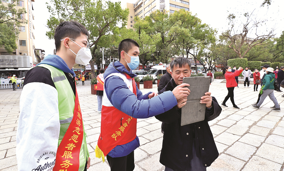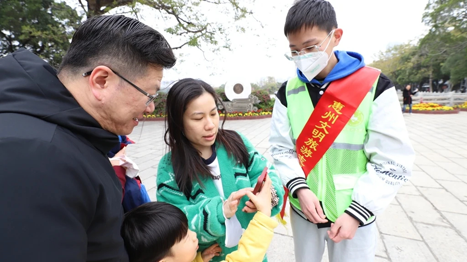 1月26日,惠州文明旅游志愿者在西湖景區(qū)服務游客。