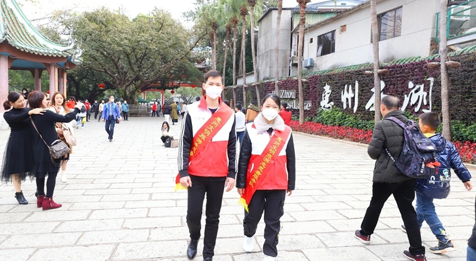 1月26日,惠州文明旅游志愿者在西湖景區(qū)巡走,開展志愿服務。