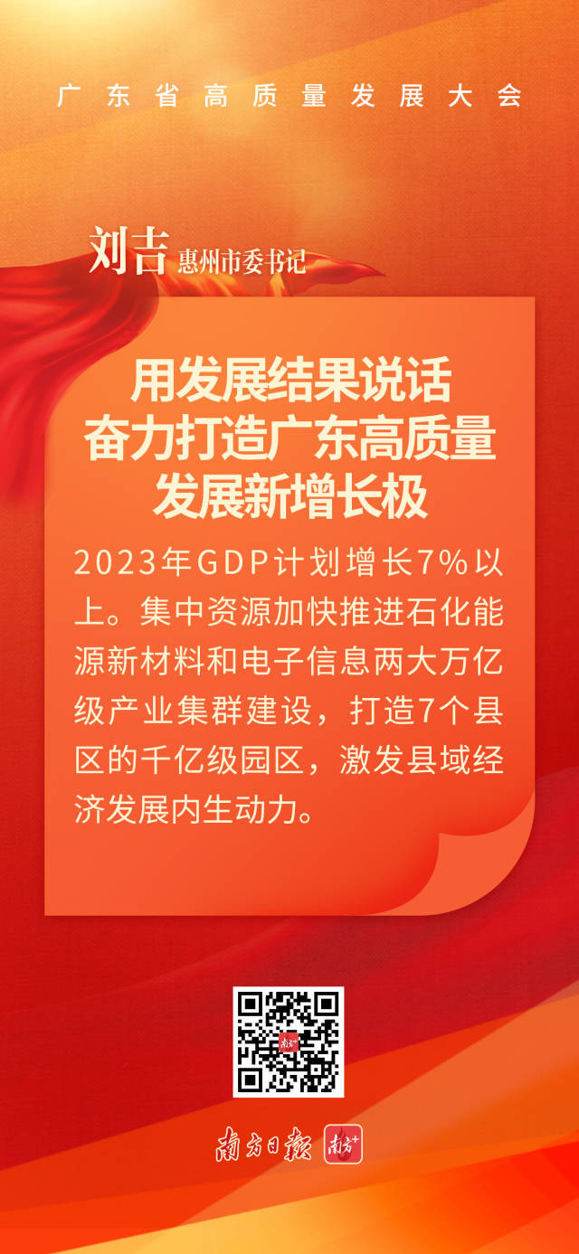 惠州市委書記劉吉表示,省委省政府開年第一天召開這次高質(zhì)量發(fā)展大會,發(fā)出了大抓實體經(jīng)濟(jì)、加快高質(zhì)量發(fā)展的動員令;葜輰^發(fā)進(jìn)取、奮勇爭先,堅決落實好省委制造業(yè)當(dāng)家戰(zhàn)略,努力交出一份合格的惠州答卷。我們將保持近幾年向上向好的態(tài)勢,2023年GDP計劃增長7%以上。我們將集中資源加快推進(jìn)石化能源新材料和電子信息兩大萬億級產(chǎn)業(yè)集群建設(shè),不斷增強產(chǎn)業(yè)核心競爭力。我們將做強做優(yōu)3個國家級園區(qū)同時打造7個縣區(qū)的千億級園區(qū),激發(fā)縣域經(jīng)濟(jì)發(fā)展內(nèi)生動力。我們清醒認(rèn)識到高質(zhì)量發(fā)展就是要實干興邦,惠州將腳踏實地、扎扎實實做好自己的事,用發(fā)展結(jié)果說話,奮力打造廣東高質(zhì)量發(fā)展新增長極。