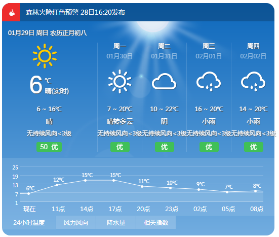 值得關(guān)注的是,受冷空氣影響,多個(gè)縣(區(qū))1月28日將寒冷預(yù)警信號(hào)升級(jí)為橙色,提醒大家繼續(xù)做好防御工作。據(jù)市氣象臺(tái)預(yù)計(jì),1月29~30日,我市各地晴天間多云,北部和東部山區(qū)局部有霜凍,最低氣溫3~6℃,日間氣溫逐日回升;1月31日,多云到陰天,云量逐漸增多,氣溫9~20℃;2月1~4日,陰天間多云,有零星小雨,早晚有(輕)霧,氣溫14~21℃。