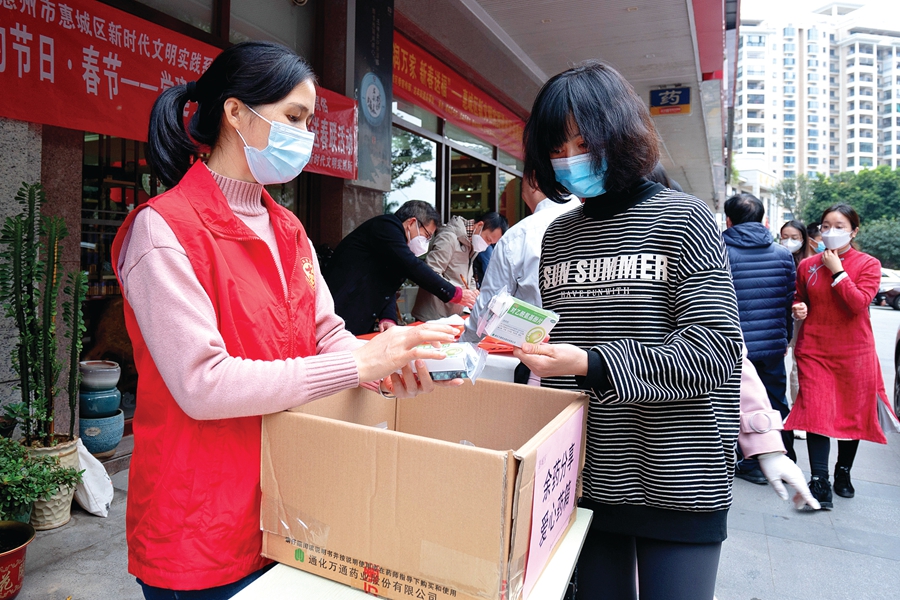 惠州開展“有余藥請(qǐng)分享,你需‘藥’大家?guī)汀惫婊顒?dòng),余藥共享深入人心。依托全市1394個(gè)文明實(shí)踐中心(所、站),我市共籌集發(fā)放布洛芬、對(duì)乙酰氨基酚等退燒藥44.7萬粒,抗原檢測(cè)試劑8000份,中成藥7萬份,覆蓋全市200余個(gè)小區(qū),為20余萬群眾解了燃眉之急。