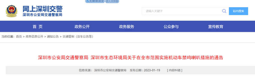 為切實控制交通噪音污染,改善城市交通環(huán)境,根據《中華人民共和國噪聲污染防治法》第四十九條、《深圳經濟特區(qū)環(huán)境噪聲污染防治條例》第六條之規(guī)定,決定在全市范圍實施機動車禁鳴喇叭的措施,具體內容通告如下: