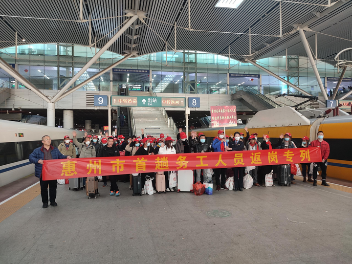 1月30日(初九)下午5時許,一趟搭載著300余名云南籍務(wù)工人員的“惠州號”專列G2924次順利抵達(dá)深圳北站,這是今年惠州首趟務(wù)工人員返崗專列,也是繼1月27日首架黔西南州務(wù)工人員返惠返崗包機(jī)之后的又一關(guān)愛務(wù)工人員、保障企業(yè)復(fù)工復(fù)產(chǎn)的舉措,將持續(xù)推動惠州大規(guī)模有組織務(wù)工人員節(jié)后有序返崗一波接著一波,一浪高過一浪。列車到站后,該批務(wù)工人員在惠州市人社部門的統(tǒng)一組織安排下,乘坐大巴安全返回惠州各企業(yè),實(shí)現(xiàn)了從“家門口”到“車門口”到“廠門口”的精準(zhǔn)接送,保障企業(yè)的節(jié)后用工需求。