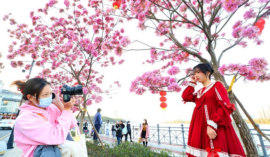 1月31日,在冬日暖陽下,陸陸續(xù)續(xù)有市民來打卡,邂逅浪漫的紫花風鈴。走近紫花風鈴木,只見滿樹枝頭都是一簇簇紫紅色的花朵,整株樹幾乎沒有葉片,猶如編織了一個紫色的風鈴。漫步其中,讓人在冬天里享受春天的感覺。