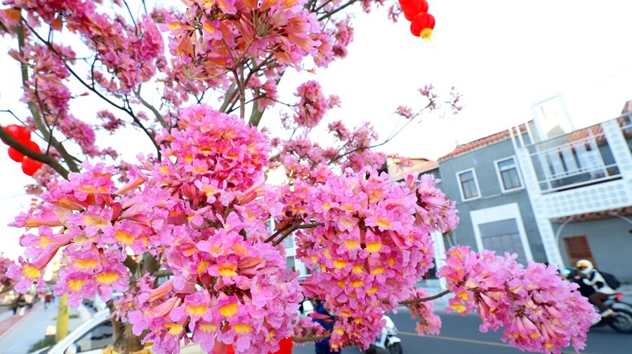 “今天我和朋友從東莞自駕來惠州游玩,路過水東街的時候發(fā)現(xiàn)這里種植了有紫花風鈴木,感覺漂亮,以前只見過黃色的風鈴木,沒想到紫色得更驚艷!崩钚〗惚硎荆S花風鈴木比較常見,紫花風鈴木聽說過但沒見過,在街上遇到一株紫花風鈴木,真的很幸運。