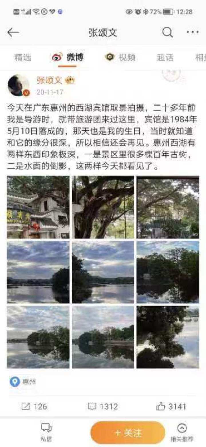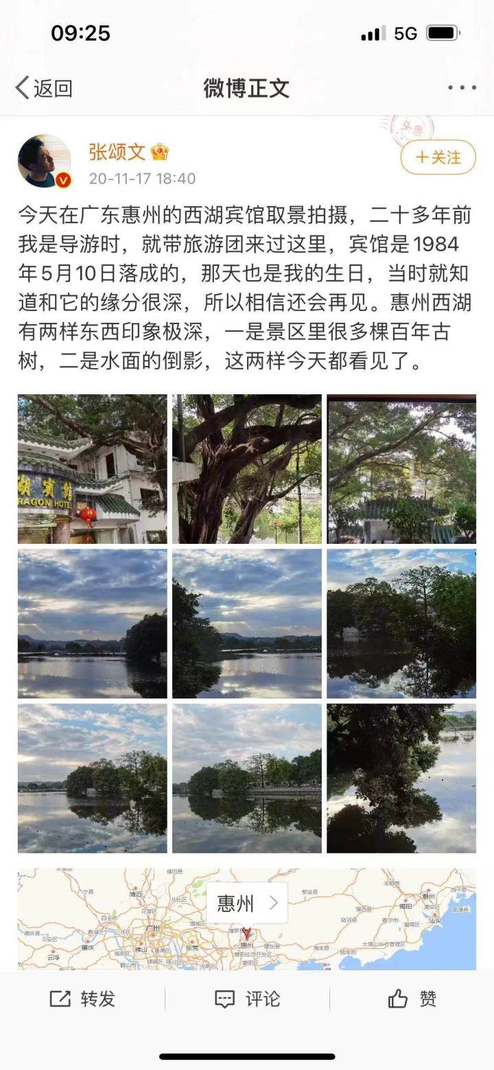 “今天在廣東惠州的西湖賓館取景拍攝,二十多年前我是導(dǎo)游時(shí),就帶旅游團(tuán)來(lái)過(guò)這里,賓館是1984年5月10日落成的,那天也是我的生日,當(dāng)時(shí)就知道和它的緣分很深,所以相信還會(huì)再見(jiàn)。惠州西湖有兩樣?xùn)|西印象極深,一是景區(qū)里很多棵百年古樹(shù),二是水面的倒影,這兩樣今天都看見(jiàn)了。”2020年11月17日,張頌文在《掃黑決戰(zhàn)》拍攝期間,發(fā)微博表達(dá)了自己的感慨,字里行間,也對(duì)惠州的秀美景色諸多贊賞。