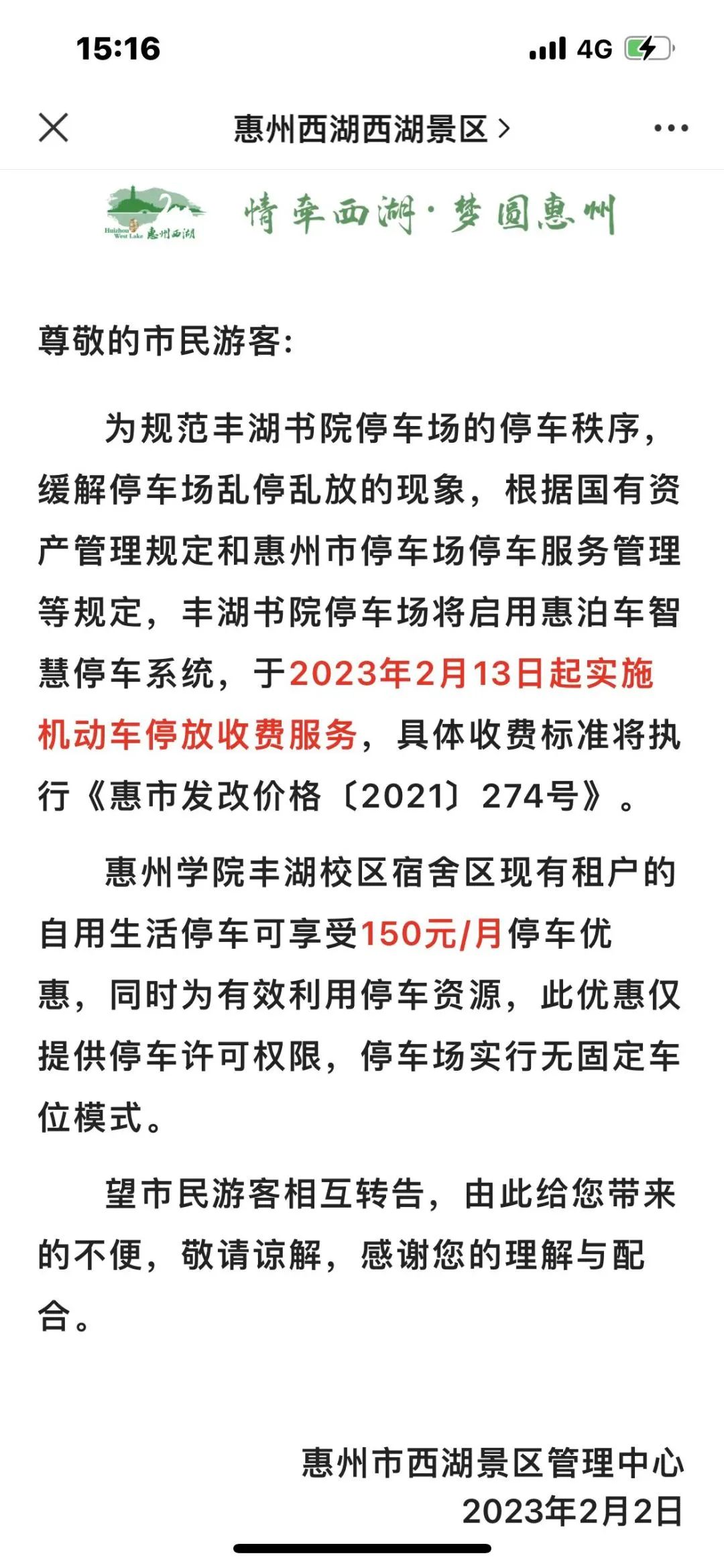 為規(guī)范豐湖書院停車場的停車秩序,緩解停車場亂停亂放的現(xiàn)象,根據(jù)國有資產(chǎn)管理規(guī)定和惠州市停車場停車服務(wù)管理等規(guī)定,豐湖書院停車場將啟用惠泊車智慧停車系統(tǒng),于2023年2月13日起實(shí)施機(jī)動(dòng)車停放收費(fèi)服務(wù),具體收費(fèi)標(biāo)準(zhǔn)將執(zhí)行《惠市發(fā)改價(jià)格〔2021〕274號(hào)》。