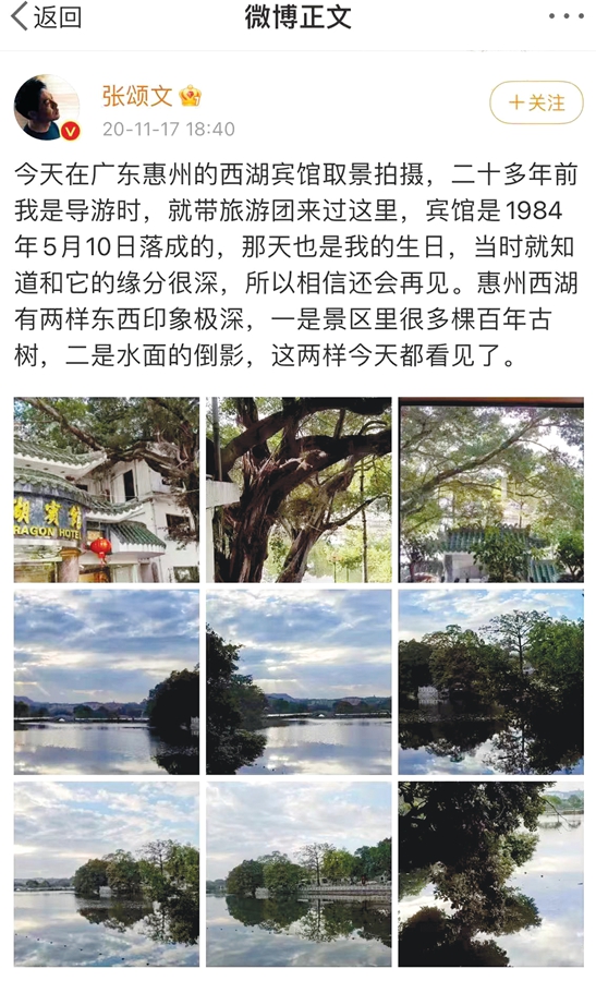 “今天在廣東惠州的西湖賓館取景拍攝,二十多年前我當導游時,就帶旅游團來過這里。賓館是1984年5月10日落成的,那天也是我的生日,當時就知道和它的緣分很深,所以相信還會再見;葜菸骱袃蓸訓|西印象極深,一是景區(qū)里很多棵百年古樹,二是水面的倒影,這兩樣今天都看見了!2020年11月17日,張頌文在《掃黑決戰(zhàn)》拍攝期間,發(fā)微博表達了自己的感慨,字里行間,對惠州的秀美景色諸多贊賞。