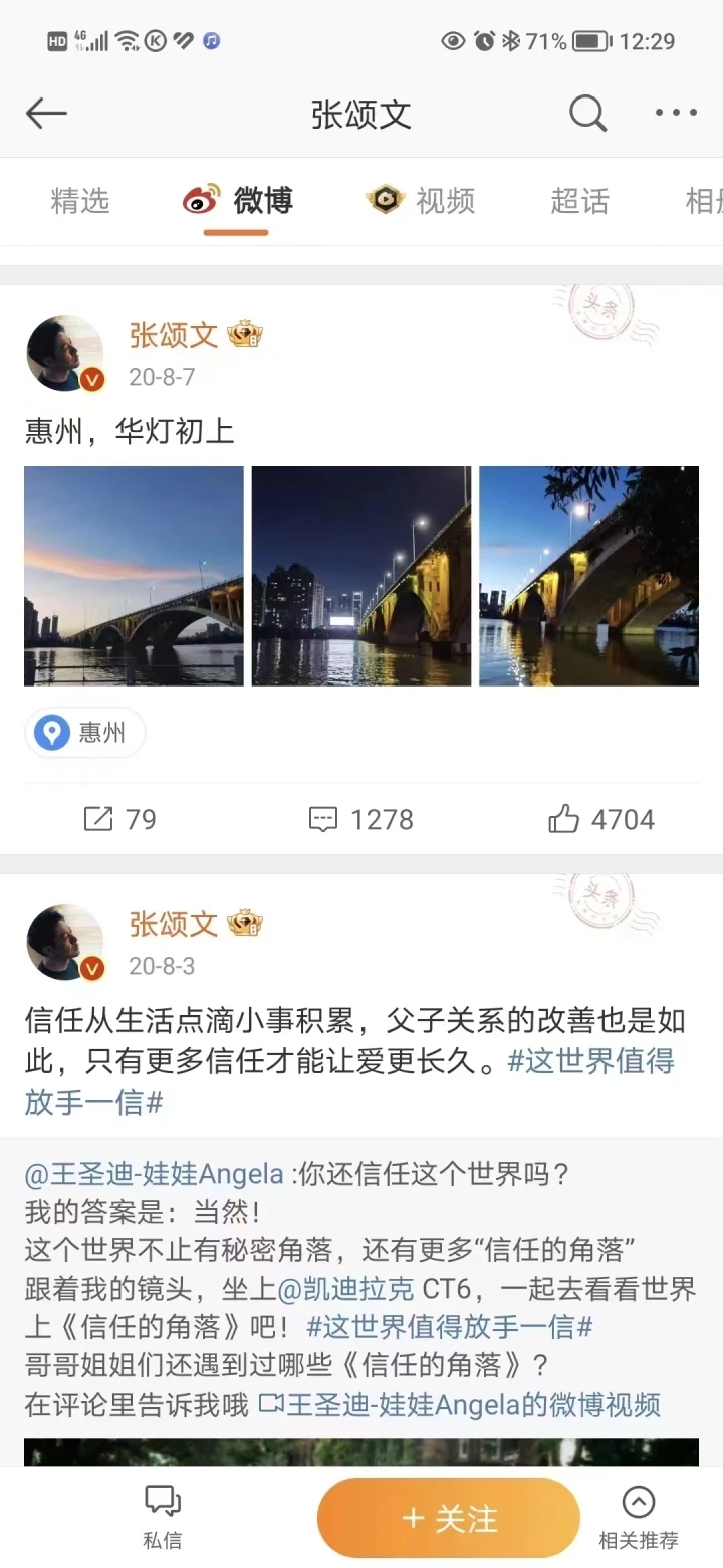 張頌文曾多次發(fā)微博為惠州西湖、惠州夜景、惠州工業(yè)文化代言。 網(wǎng)絡截圖