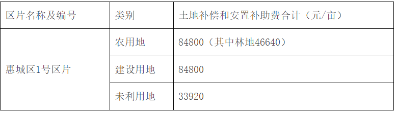 土地補償費和安置補助費按《惠州市人民政府關(guān)于公布實施征收農(nóng)用地區(qū)片綜合地價的公告》(惠府公〔2021〕4號)規(guī)定的惠城區(qū)1號區(qū)片綜合地價標(biāo)準(zhǔn)執(zhí)行,其中全市統(tǒng)一設(shè)定林地調(diào)節(jié)系數(shù)0.55,征收建設(shè)用地參照征收農(nóng)用地區(qū)片綜合地價執(zhí)行,征收未利用地參照征收農(nóng)用地區(qū)片綜合地價設(shè)定調(diào)節(jié)系數(shù)0.4執(zhí)行。