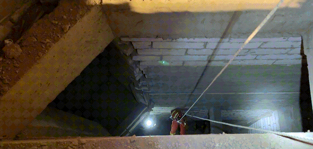 消防救援人員現(xiàn)場發(fā)現(xiàn),一名男子掉入約12米深的墻體夾縫中,空間狹窄,所幸男子意識清醒,但無法自主活動。