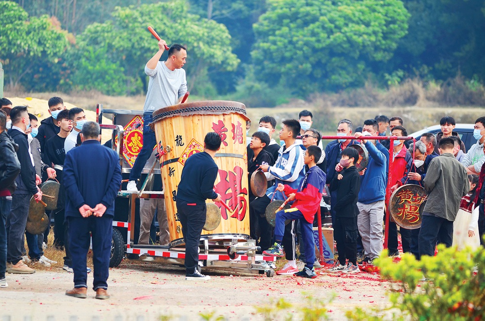 “震鼓獵龍一般選在正月新年的某一天,由村里的男丁將大鼓和銅鑼運(yùn)到野外的小山丘,等到約好的時(shí)辰開(kāi)始敲鑼打鼓,同時(shí)一路燃放鞭炮往回趕!饼埲A大鼓的非遺傳承人李滿池介紹,“獵”在客家話中有“趕”的意思,“獵龍”就是到山上將龍當(dāng)作牛馬羊趕回去,鑼鼓聲起著驅(qū)趕作用。一般一個(gè)宗族如果一年來(lái)沒(méi)有添男丁,就會(huì)組織獵龍活動(dòng)。