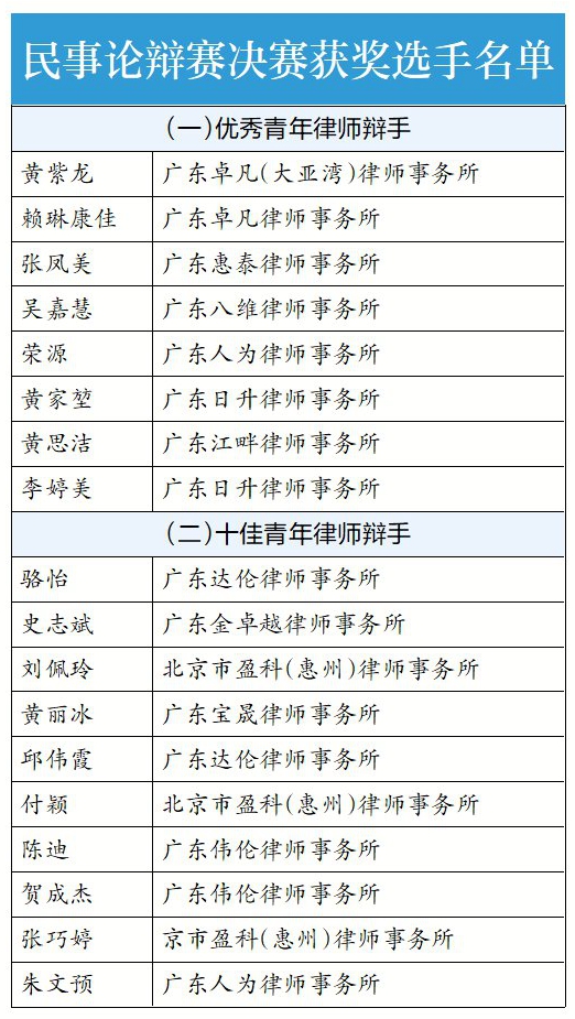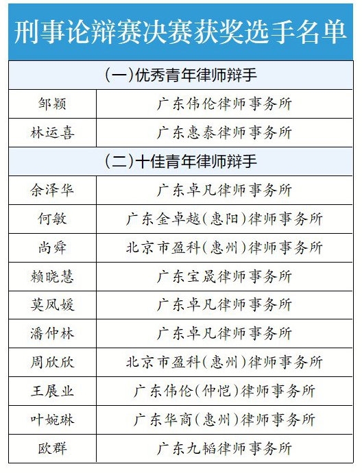 最終,論辯賽共決出2名惠州市首屆刑事論辯賽優(yōu)秀青年律師辯手、10名十佳青年律師辯手(下面表格中前三為最佳青年律師辯手),以及8名惠州市首屆民事論辯賽優(yōu)秀青年律師辯手、10名十佳青年律師辯手(下面表格中前三為最佳青年律師辯手)。
