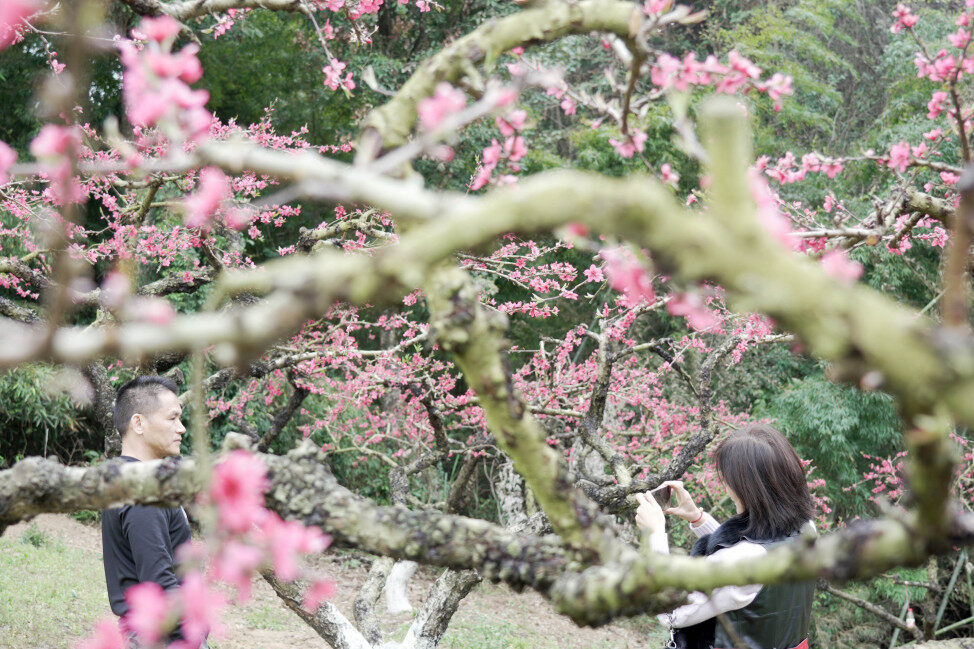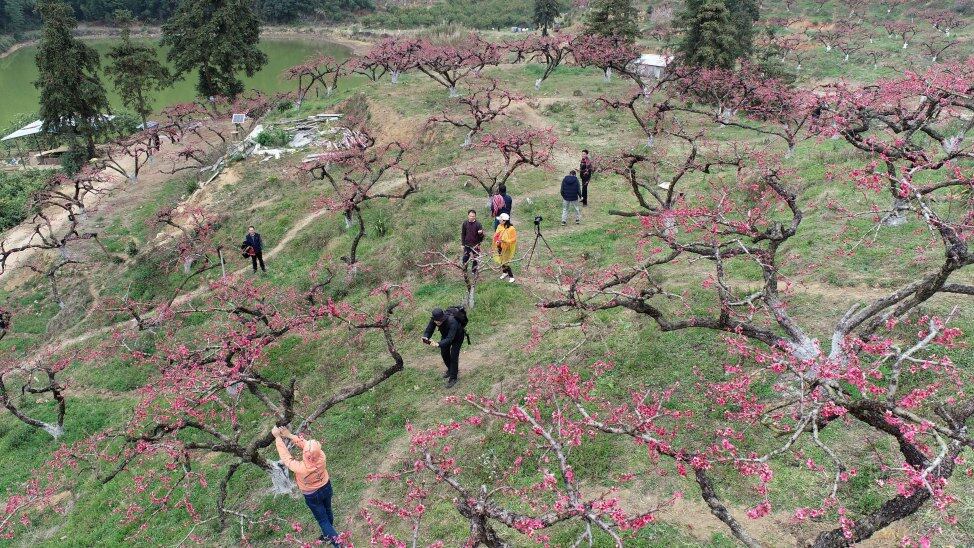 桃花盛開吸引大批游客前來賞花。