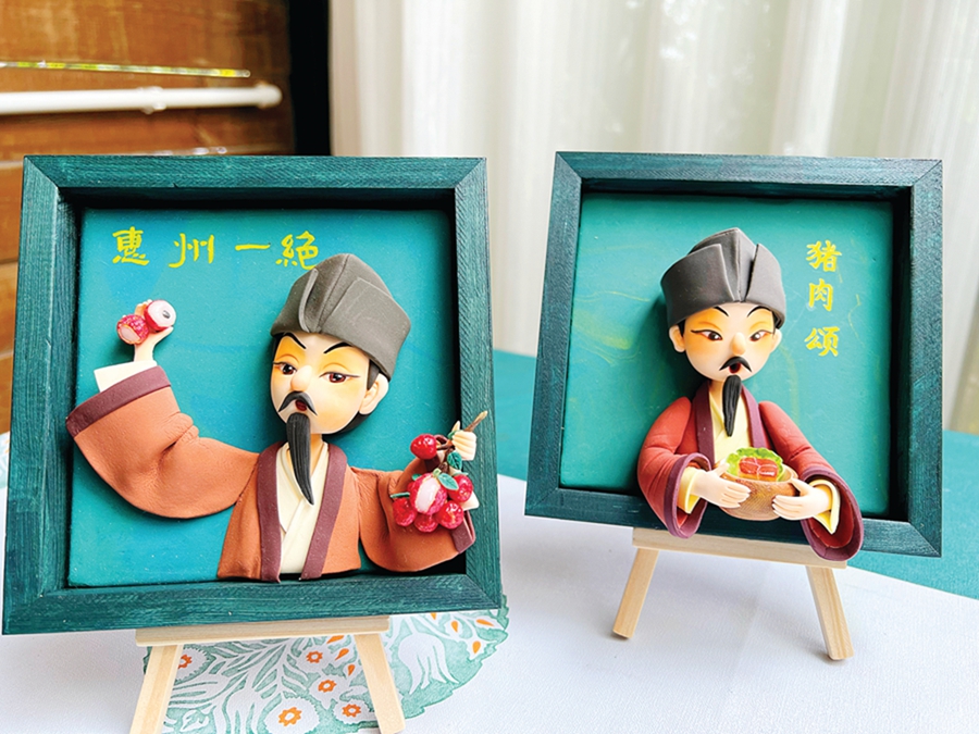何瑞霞安安靜靜地創(chuàng)作,在她身后不遠(yuǎn)處,目之所及的惠州西湖水,波光粼粼。因為家在豐湖書院附近,承載著蘇東坡詩意人生的惠州西湖給了她不少創(chuàng)作靈感。她想通過黏土作品展現(xiàn)蘇東坡平生謫居軌跡與美食的交集。她手中正在創(chuàng)作蘇東坡與東坡肉。最近,她已完成作品《惠州一絕》,“日啖荔枝三百顆,不辭長作嶺南人”。蘇東坡手持紅彤彤的荔枝,形態(tài)活潑可愛,手中的荔枝有的露出了“冰肌”,美味的氛圍感十足。