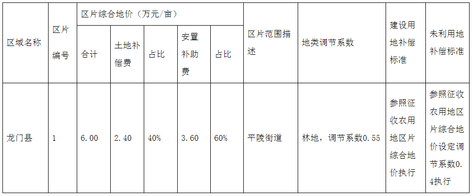 。ㄒ唬┱鞯匮a償標準。土地補償和安置補助費按《惠州市人民政府關于公布實施征收農用地區(qū)片綜合地價的公告》(惠府公〔2021〕4號)規(guī)定的龍門縣1號區(qū)片綜合地價標準執(zhí)行;其中全市統(tǒng)一設定林地調節(jié)系數(shù)0.55,征收建設用地參照征收農用地區(qū)片綜合地價執(zhí)行,征收未利用地參照征收農用地區(qū)片綜合地價設定調節(jié)系數(shù)0.4執(zhí)行。