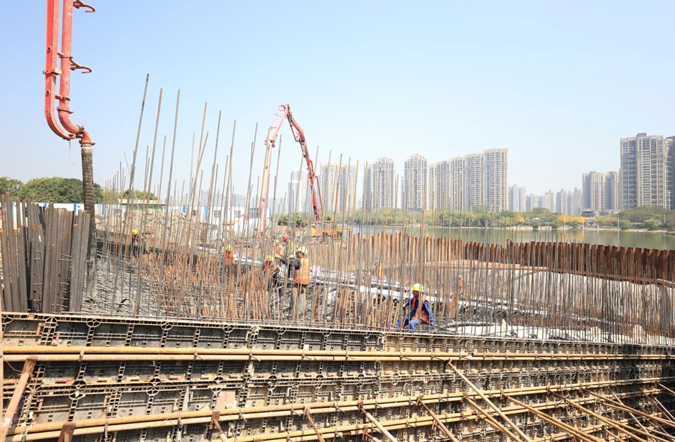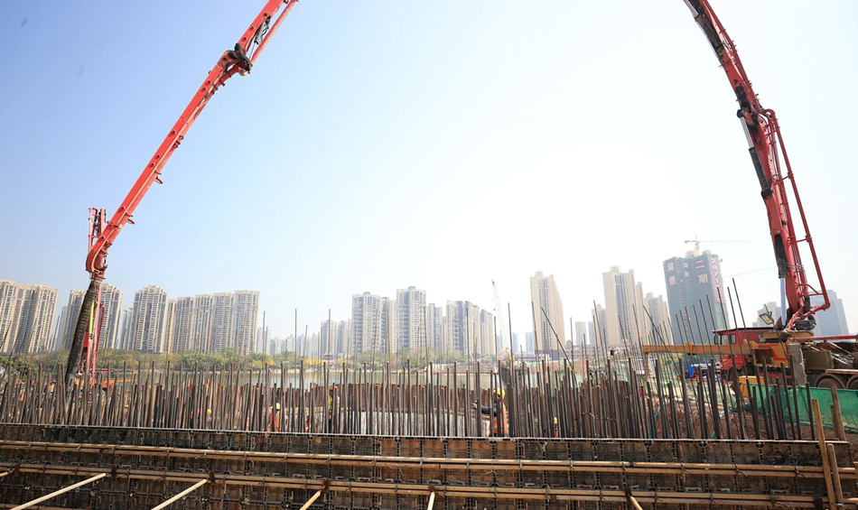 2月28日晚開始承臺(tái)澆筑的是金山湖一號(hào)橋。記者3月1日上午在現(xiàn)場看到,混凝土天泵車伸出長臂,將一車車混凝土澆筑到承臺(tái)內(nèi)!拔覀冋谶M(jìn)行0號(hào)承臺(tái)的混凝土澆筑施工,橋梁共設(shè)置2個(gè)承臺(tái),承臺(tái)長44.61米、寬36米、高4.5米,單個(gè)承臺(tái)混凝土方量為7300立方米!苯鹕胶惶(hào)橋項(xiàng)目副經(jīng)理鄧子敬介紹,金山湖一號(hào)橋橋梁全長283米,為保證一次性跨越金山湖水道,橋梁設(shè)計(jì)凈跨達(dá)到196米,在相同結(jié)構(gòu)橋梁中,其跨度在全國位居前列。