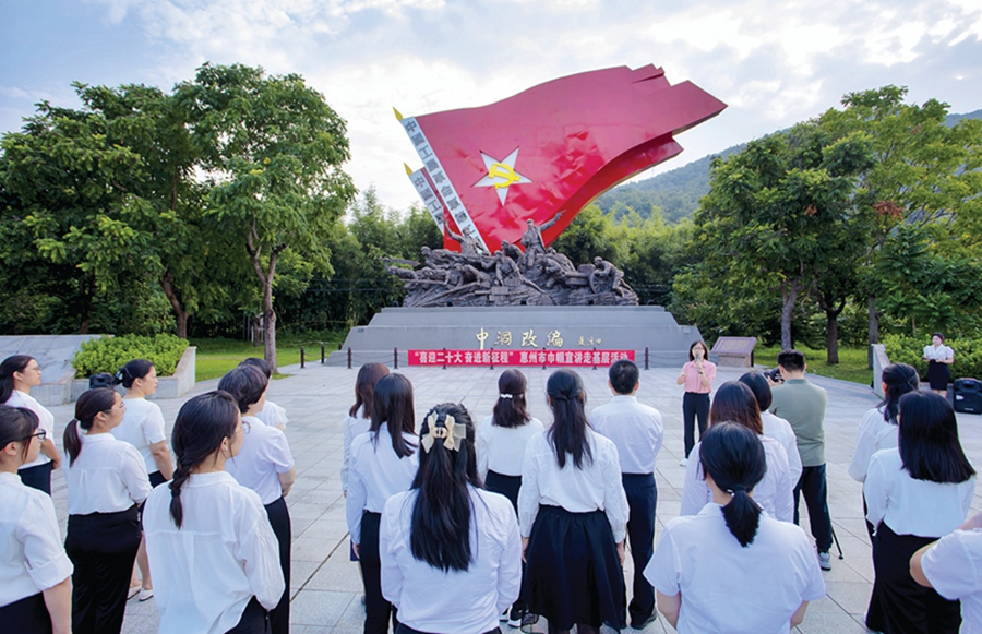 在惠東縣高潭中洞革命老區(qū)紀(jì)念碑前,廣東省“巾幗文明崗”領(lǐng)銜人、惠州城市職業(yè)學(xué)院馬克思主義學(xué)院院長(zhǎng)孟美玲,聲情并茂地講述高潭中洞的革命歷史,戴煥其、英雄母親吳嫂等革命先烈的紅色故事,高潭革命精神的深刻內(nèi)涵和時(shí)代價(jià)值,號(hào)召大家學(xué)習(xí)忠誠(chéng)如鐵、敢為人先、不怕?tīng)奚⒁煌鶡o(wú)前的高潭革命精神。沉浸式的宣講,滌蕩著在場(chǎng)的每一個(gè)人的心靈。