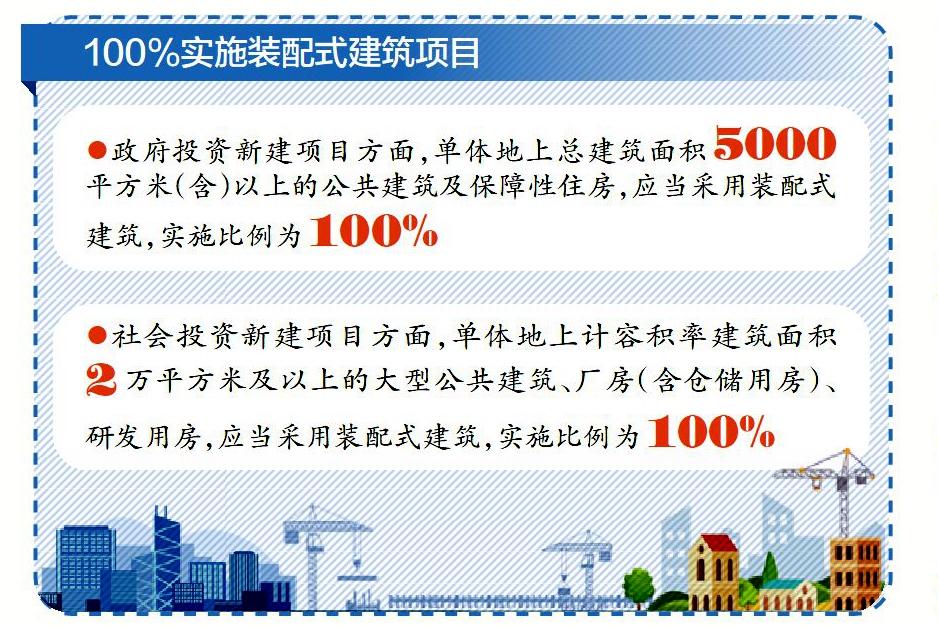 自《通知》印發(fā)之日起,我市政府投資新建項目單體地上總建筑面積5000平方米(含)以上的公共建筑及保障性住房,以及社會投資新建項目單體地上計容積率建筑面積2萬平方米及以上的大型公共建筑、廠房(含倉儲用房)、研發(fā)用房,應(yīng)當采用裝配式建筑,實施比例為100%。