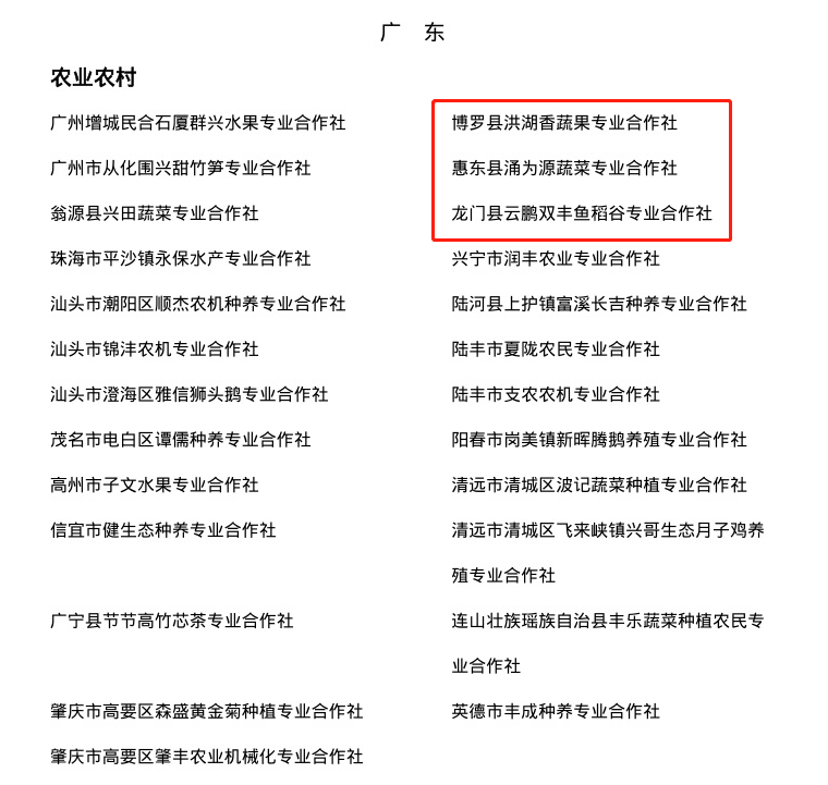 3月9日,新一批國家農(nóng)民合作社示范社評定名單進(jìn)行公示,惠州3家合作社入選公示名單,分別為博羅縣洪湖香蔬果專業(yè)合作社、惠東縣涌為源蔬菜專業(yè)合作社、龍門縣云鵬雙豐魚稻谷專業(yè)合作社。