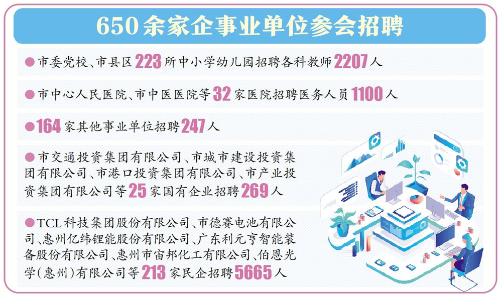 據(jù)了解,本次共有650余家企事業(yè)單位參會(huì),具體包括市委黨校、市縣區(qū)223所中小學(xué)幼兒園招聘各科教師2207人;市中心人民醫(yī)院、市中醫(yī)醫(yī)院等32家醫(yī)院招聘醫(yī)務(wù)人員1100人;164家其他事業(yè)單位招聘247人;市交通投資集團(tuán)有限公司、市城市建設(shè)投資集團(tuán)有限公司、市港口投資集團(tuán)有限公司、市產(chǎn)業(yè)投資集團(tuán)有限公司等25家國有企業(yè)招聘269人;TCL科技集團(tuán)股份有限公司、市德賽電池有限公司、惠州億緯鋰能股份有限公司、廣東利元亨智能裝備股份有限公司、惠州市宙邦化工有限公司、伯恩光學(xué)(惠州)有限公司等213家民企招聘5665人。