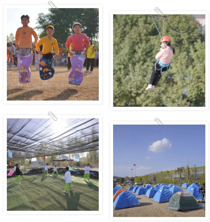 我們可以玩拓展游戲、露營(yíng)、看表演、吃美食、放煙花、參加篝火晚會(huì)……