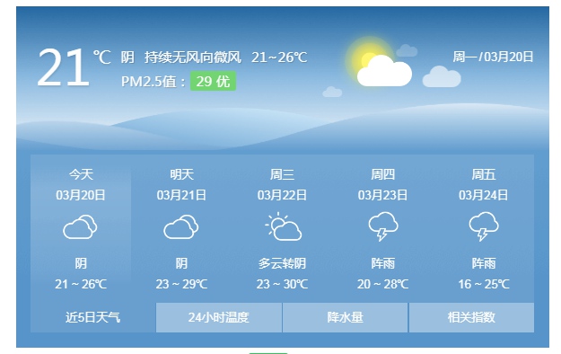 預(yù)計今天,我市陰天到多云,局部有零星小雨,早晚有輕霧,最低氣溫19°C左右,最高氣溫24~26°C;