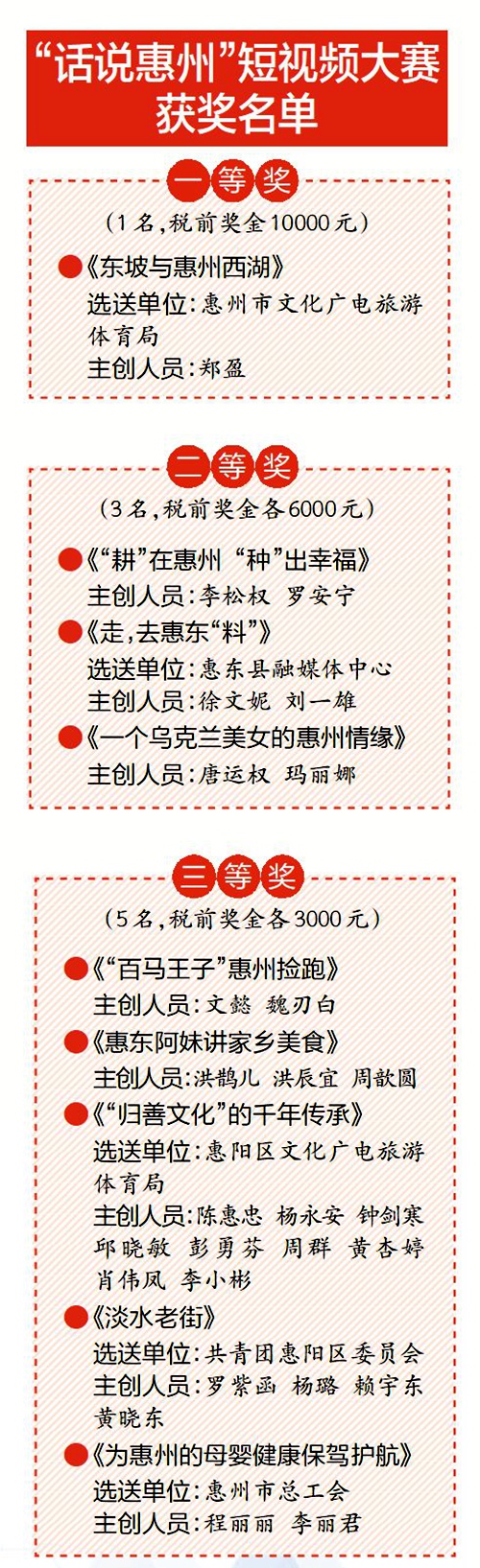 據(jù)了解,2022年7月15日,由中共惠州市委宣傳部主辦、惠州日?qǐng)?bào)社承辦的“話說惠州”短視頻大賽正式啟動(dòng);顒(dòng)為期半年,共征集展播參賽作品近150條,成為當(dāng)年惠州關(guān)注度最高、影響力最大的城市形象主題短視頻宣傳活動(dòng),獲得社會(huì)各界廣泛好評(píng)。