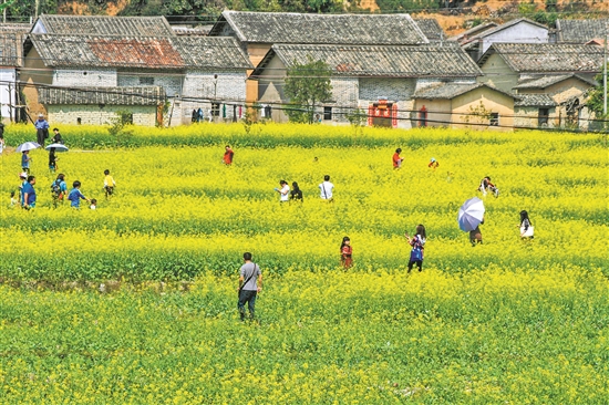 油菜花田里,游客用鏡頭捕捉春意 吳偉榮 攝